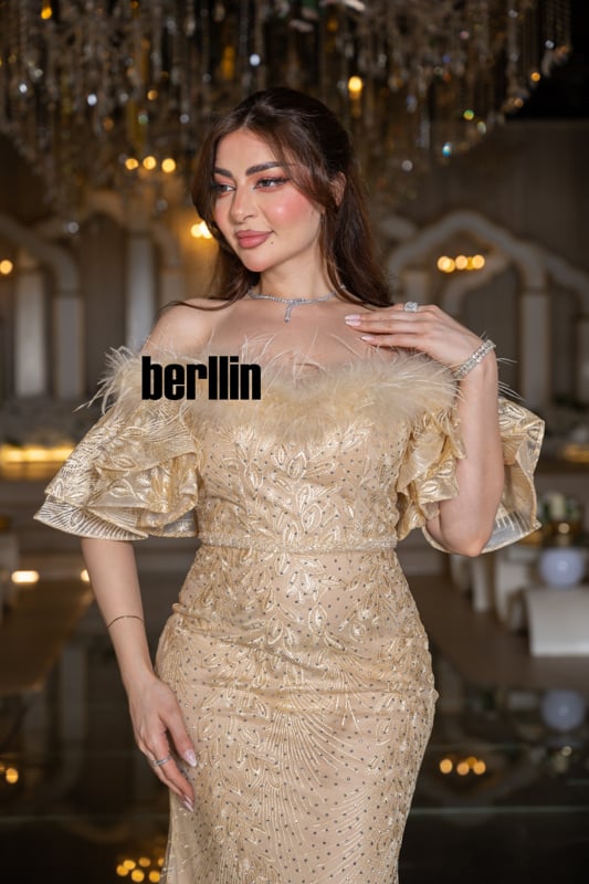 تألّقي بوهجٍ ذهبي ناعم مع “رفرفة الذهب”؛ فستان حورية يلتفّ حول قوامك بقماش تول شامبانيا مطرّز بالكامل بخيوط لامعة وأحجار كريستال دقيقة تعكس الأضواء كالمرايا الصغيرة. يلفّ خط الصدر طوقٌ من الريش الطبيعي ينساب بخفة حول الأكتاف، بينما تضفي الأكمام البالونية لمسة مسرحية راقية. قصّته الميرميد تبرز منحنياتك برقيّ، وتتفتح من الركبتين بذيل خفيف يمنحك حركة واثقة على منصة أي سهرة أو حفل رسمي. ارتديه ليكون حضورك عنوان الفخامة وأول ما يتلألأ تحت الثريّات.
