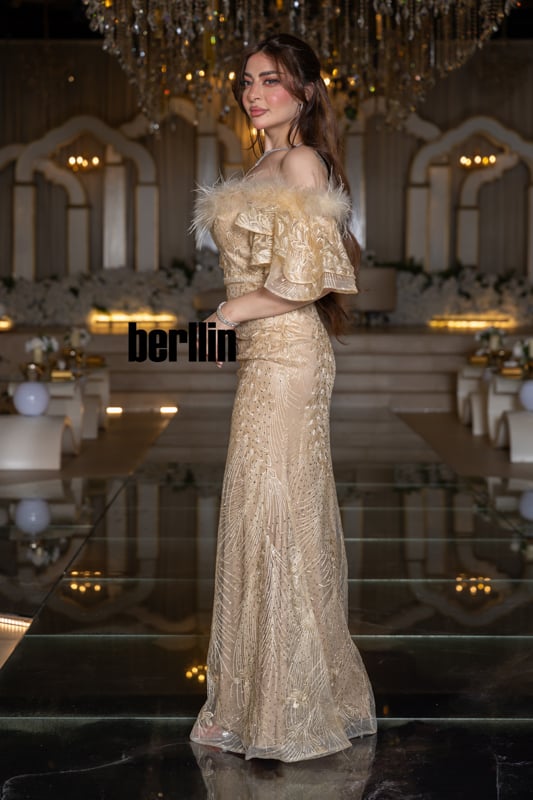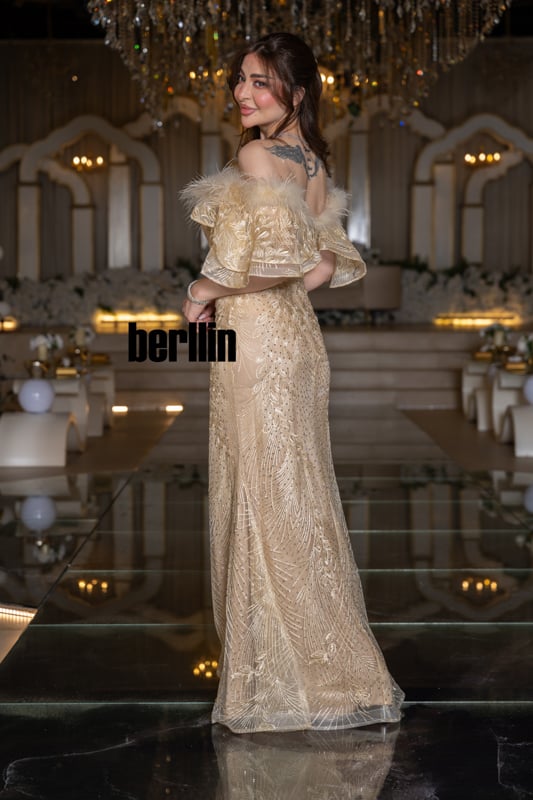 القماش يلتصق بلطف على الجلد، بينما يطفو الريش حول الكتفين كغمامة حريرية تلامس الهواء. عند الحركة، يلمع التطريز برشاقة، فتبدو الإضاءة وكأنها تسري عبر خيوط الفستان وليس فوقه فقط.