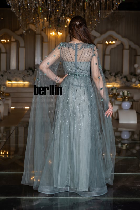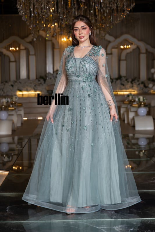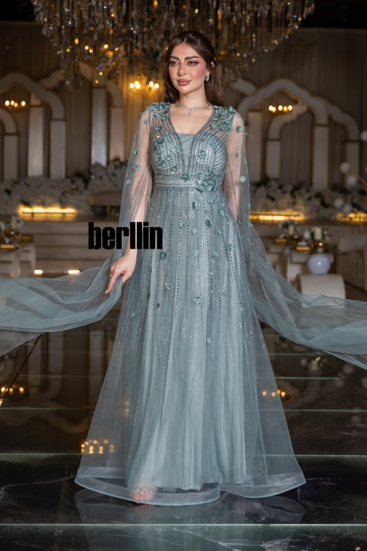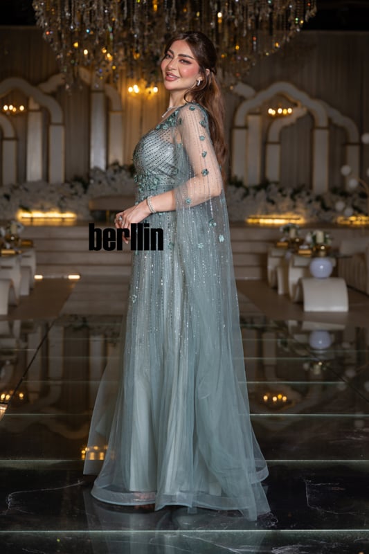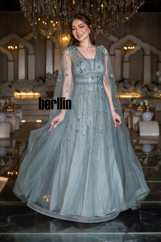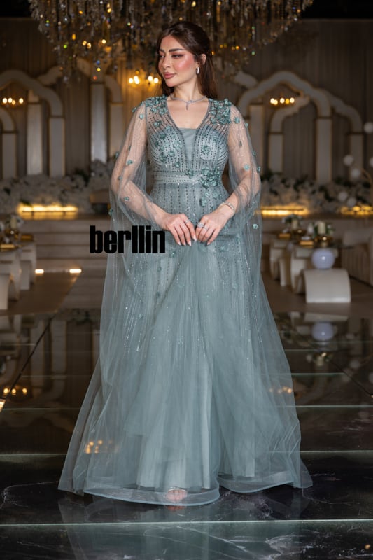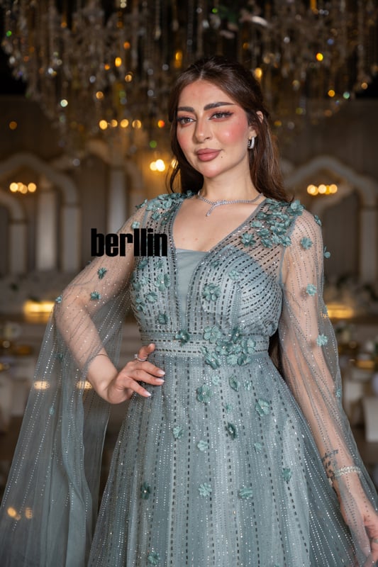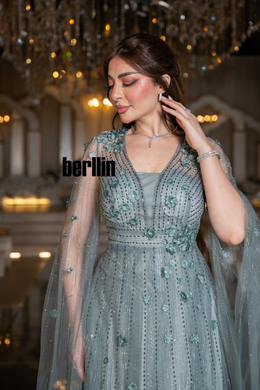 يتلألأ التطريز الكريستالي كندى الفجر على أوراق الصنوبر، بينما يتحرّك الكاب حولك كضبابٍ أخضر يحيطك بهالة من الغموض والرقيّ. كل بادرة تضيف ومضة زمردية تشدّ الأنظار وتُبقي العيون مأخوذة بنبض إطلالتك.