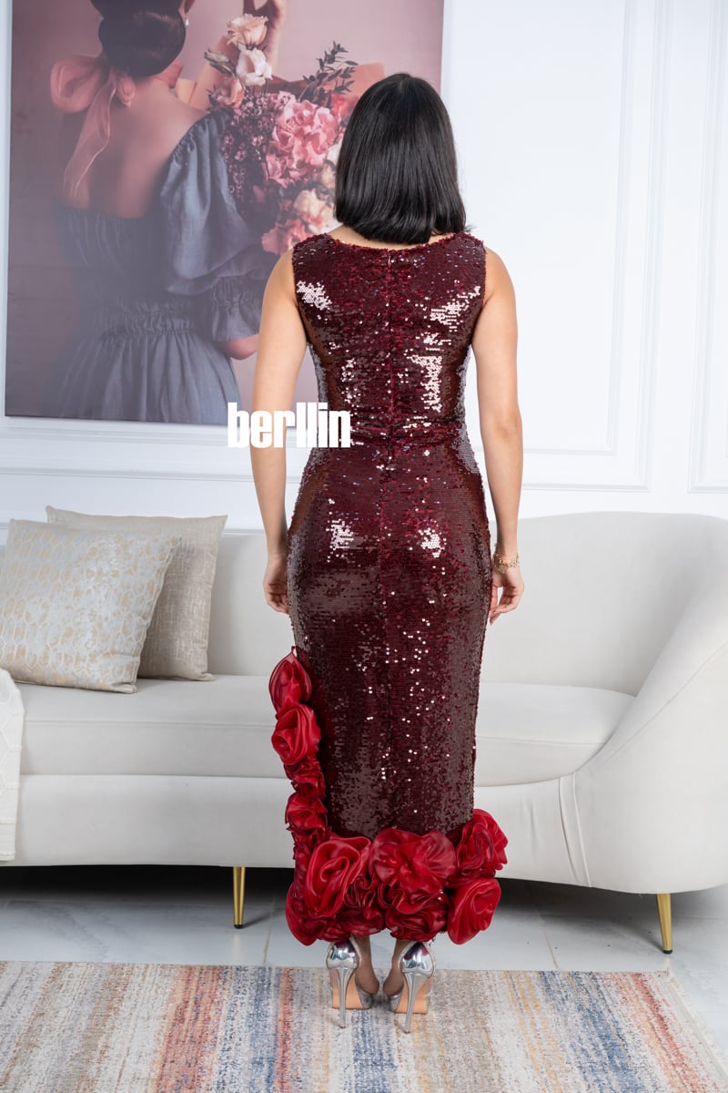 - فستان سهرة أنيق بلون خمري جذاب، مصمم بقصة ضيقة تبرز جمال القوام. يتميز بتطريز فاخر من الترتر اللامع الذي يضفي لمسة ساحرة وبراقة. ما يميزه أكثر هو فتحة جانبية أنيقة مزينة بتفاصيل ورود بارزة من القماش الأحمر، مما يضيف لمسة رومانسية وجاذبية راقية. الفستان بدون أكمام وبياقة مستديرة كلاسيكية، مما يجعله مثالياً للمناسبات الفاخرة والسهرات المميزة.