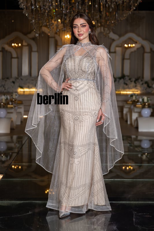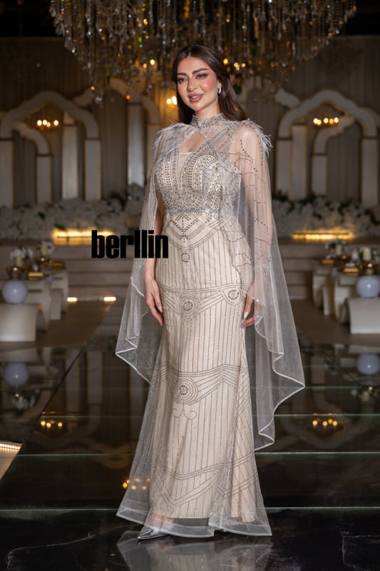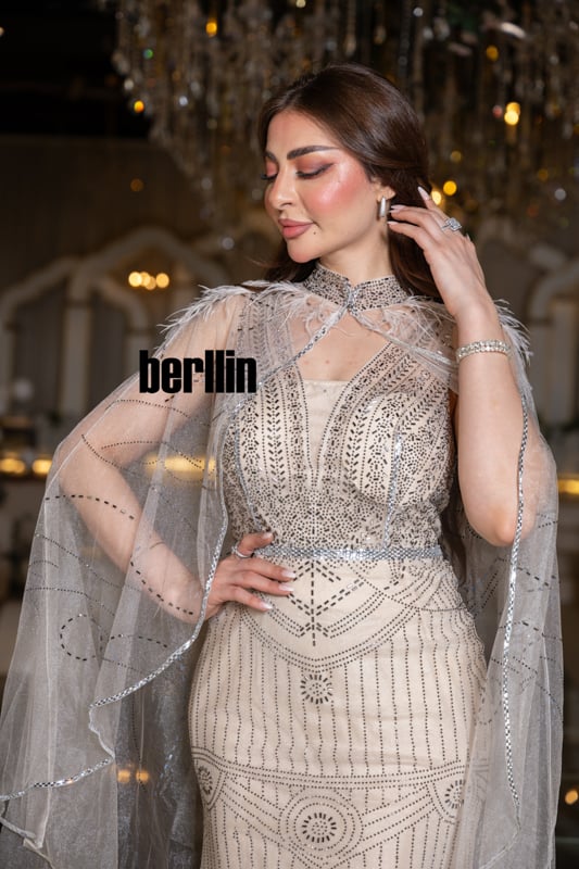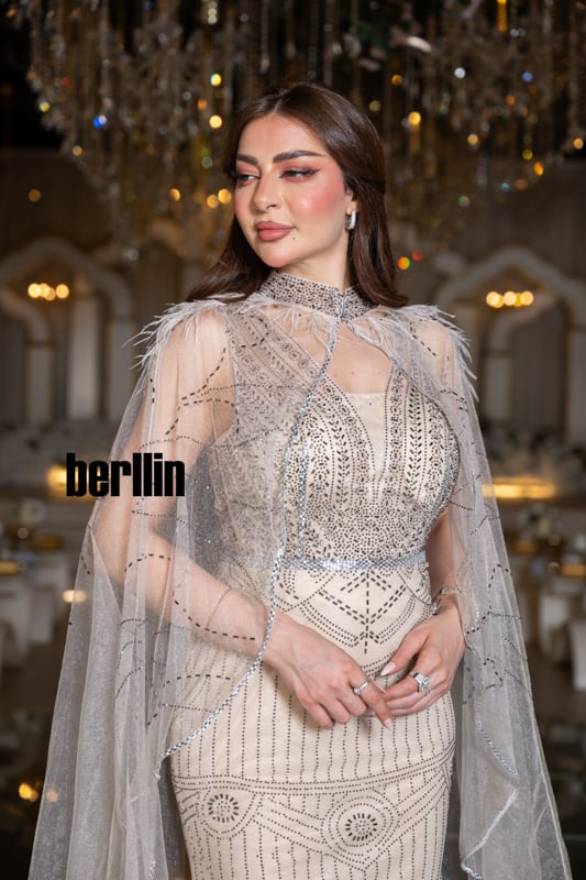 يخفق الكاب حولك كسحابةٍ فضيّة كلّما تحرّكتِ، فيما يلتقط التطريز الماسيّ الضوء ليشكّل ومضاتٍ ناعمة كأنّ نجوم الليل اتّحدت مع ثوبك. الفستان يوازن بين الهيبة والرقة، فيُشعرك بأناقة ملكيّة تمتزج بلمسة أنثوية دافئة.