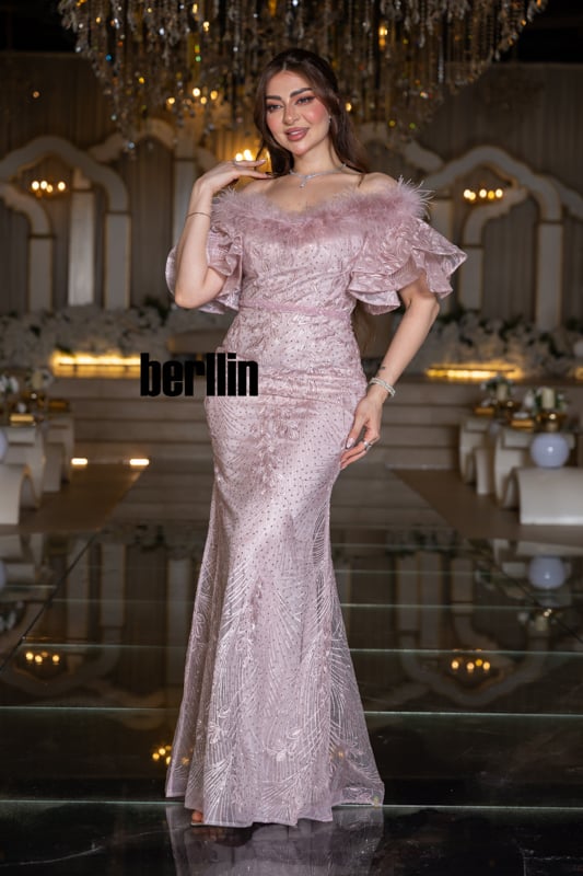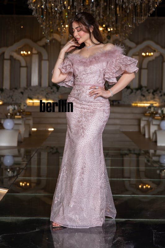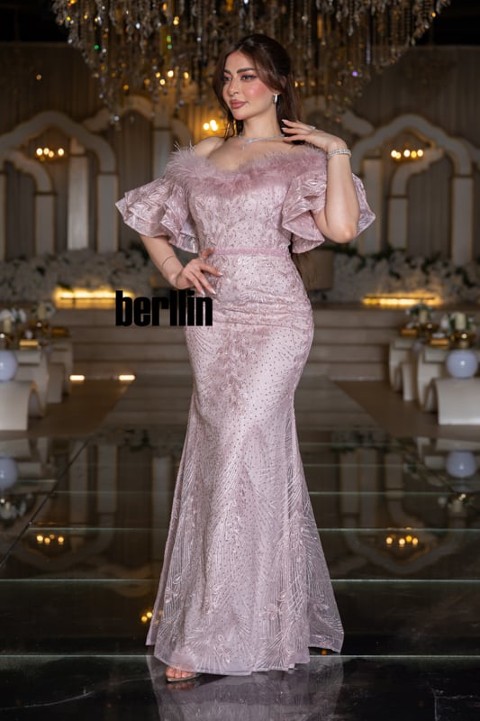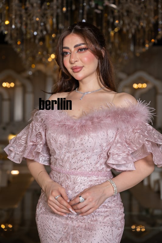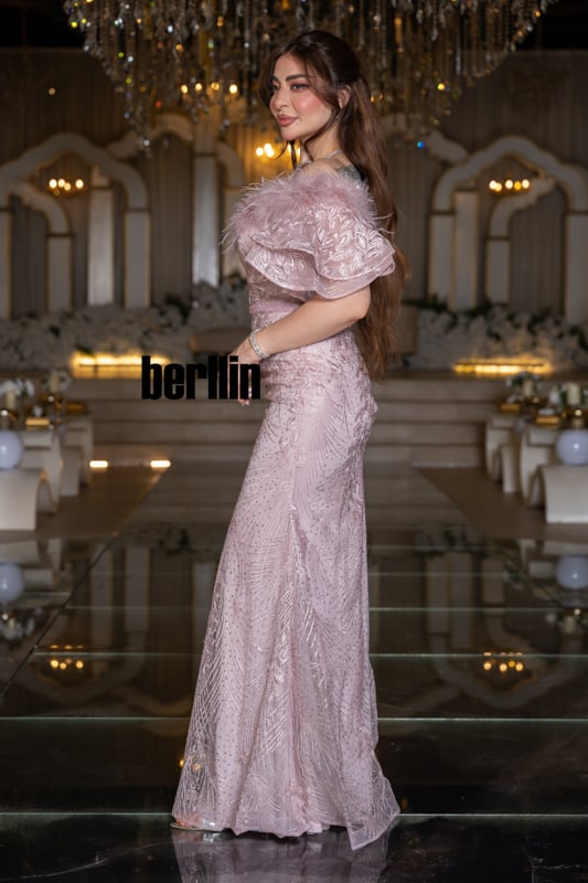 استُلهم هذا الفستان من امتزاج الوردي والبنفسجي لحظة شروق الشمس. طوقٌ من ريش النعام الوردي يحيط بالياقة المكشوفة ليشكّل غيمة حالمة فوق البشرة، فيما تنسدل الأكمام البالونية بطيّات واسعة تمنح حركة فراشية مع كل التفاتة.