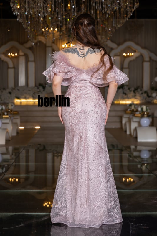 القماش من تول فاخر وردي مائل إلى اللافندر، مطرّز يدويًّا بنقوش أوراق طاووس دقيقة وخيوط لوركس لامعة. أحجار ستراس متناهية الصغر تبدو كـ«رذاذ نجمي» يلتقط الإضاءة من أي زاوية. الريش الطبيعي مُعالج للحفاظ على نعومته وثباته طوال السهرة.