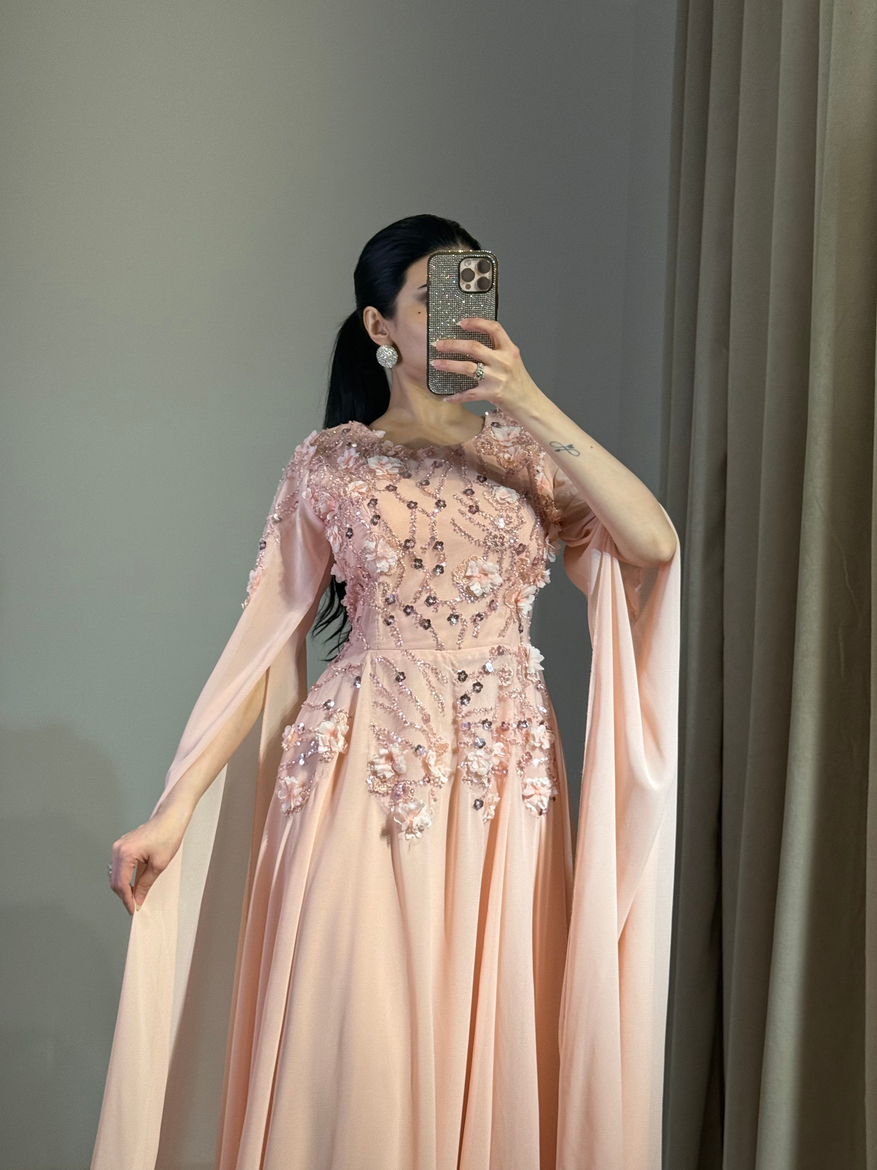 انسدلي بإطلالة تأسر الأنفاس مع هذا الفستان الأسود العميق بخامة شيفون تتراقص بانسيابية حريرية، وتطريز زهري ثلاثي الأبعاد يشعّ بريقًا خافتًا كحبات الياقوت على ضوء الشموع. قصّة A-Line تُنحّت الخصر برقة وتمنح قامة أطول، بينما الأكمام الكاب تنسدل كأجنحة أنثوية تُضفي لمسة درامية هادئة.