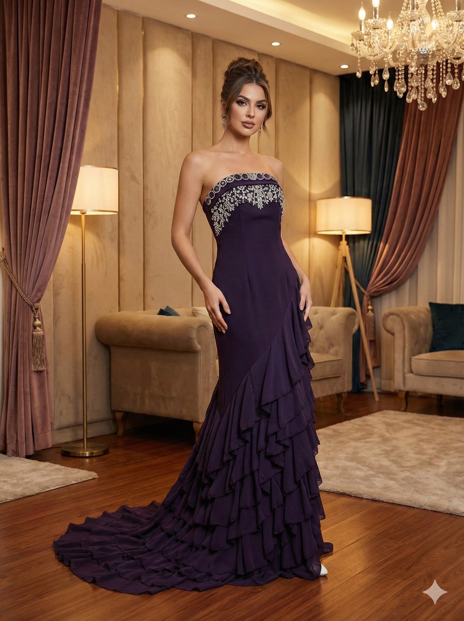 أما الجزء السفلي، فهو حكاية أخرى من الجمال؛ حيث تنسدل التنورة بطبقات متدرجة وكثيفة من الكشكش (Ruffles) العمودي، مما يمنحكِ حركة دراماتيكية وانسيابية ساحرة مع كل خطوة تخطينها. هذا الفستان هو الخيار الأمثل للمرأة التي تبحث عن التميز، الفخامة، والاختلاف في مناسباتها الخاصة.