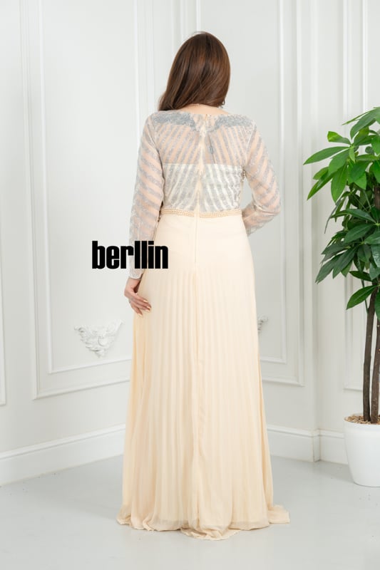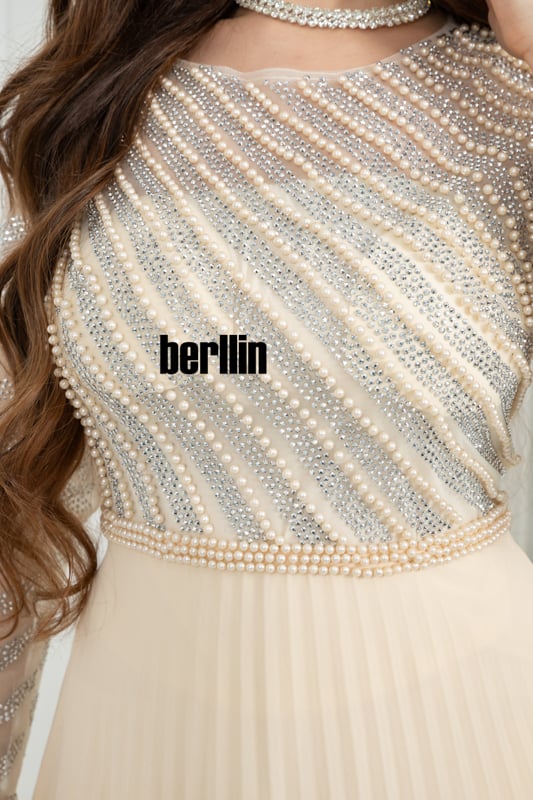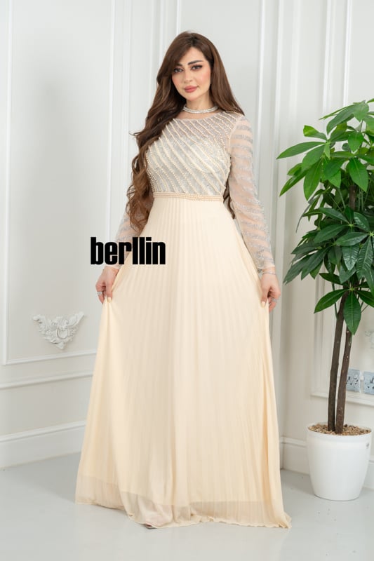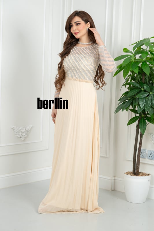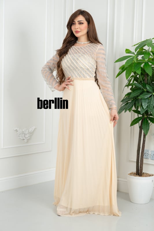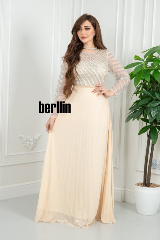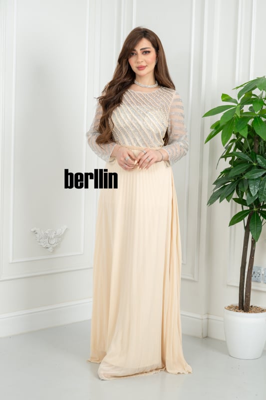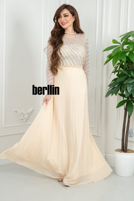 ينساب هذا الفستان البيج كخيط ضوء ذهبي؛ تتلألأ خطوط الترتر على صدرك كأمواج فضية، فيما ترقص طيات التنورة البليسيه مع كل خطوة لتخلّف هالة من الرقي الهادئ.