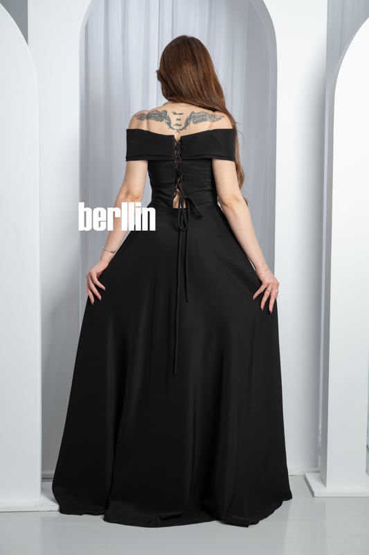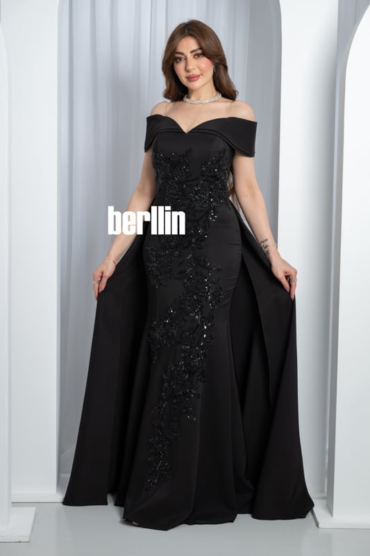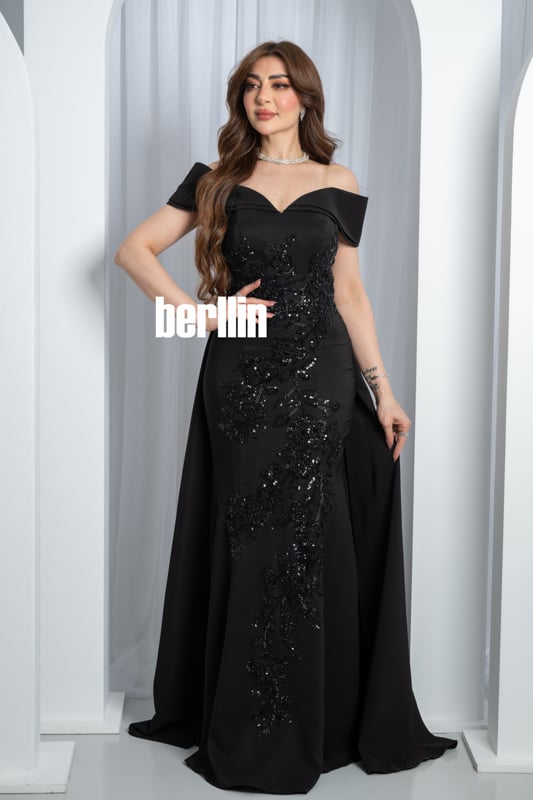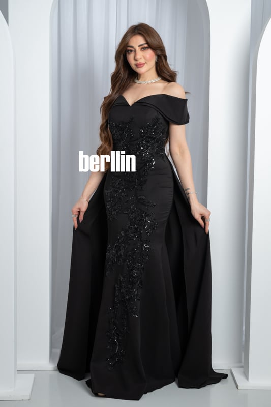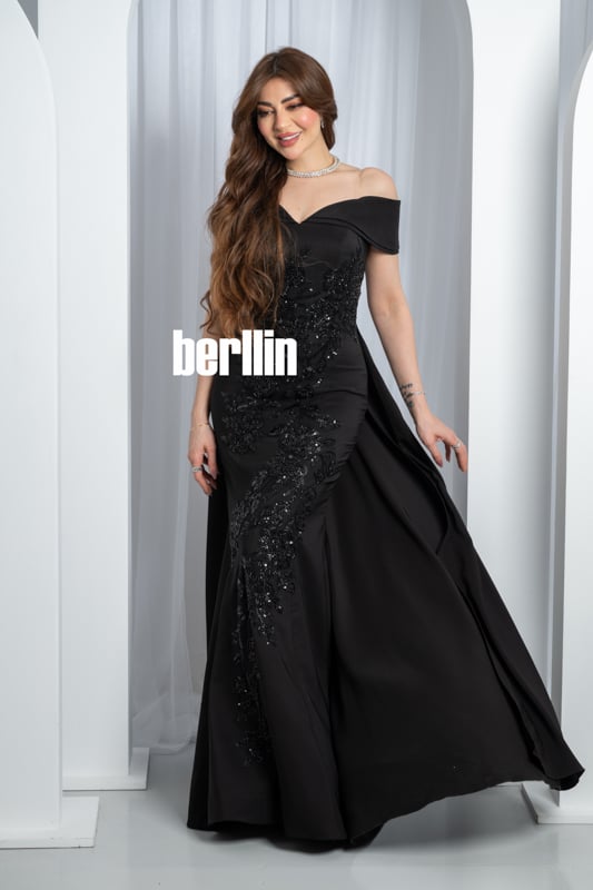 تخيّلي هالة السحر حين تتلألأ خيوط التطريز السوداء تحت الأضواء، لتُعيد رسم قوامك برشاقة منحوتة وتمنحك مظهراً أشبه بسمفونية ليلية آسرة. يعانق خط الأكتاف المكشوفة بشرتك كالحرير، فيبرز تمازج الأنوثة والقوة بلمسة رومانسية تأسر الأنظار. أما القصة المُحكمة فتنحت خصرك بانسيابية ثم تنساب بذيلٍ فاخر يترك خلفك أثر فخامة مبهرة، لتعيشي لحظة تُحفر في الذاكرة كعنوان للجاذبية المطلقة.