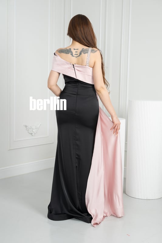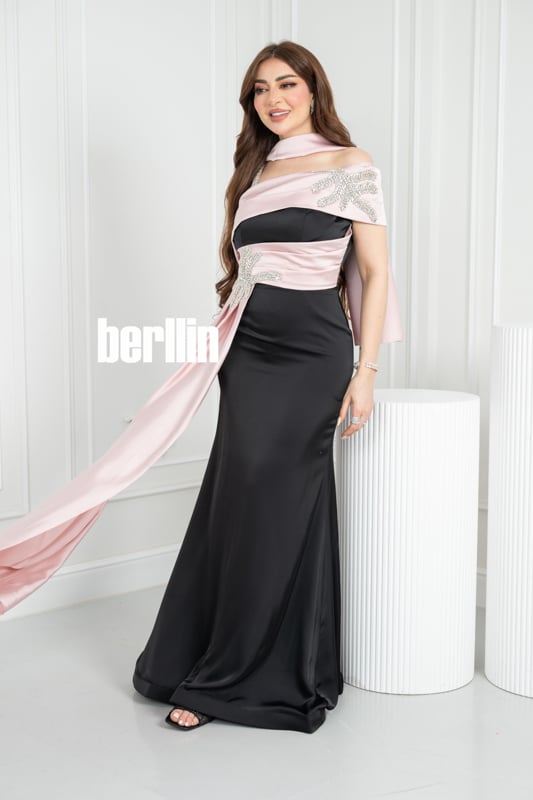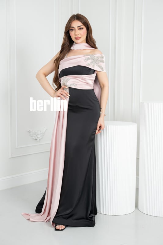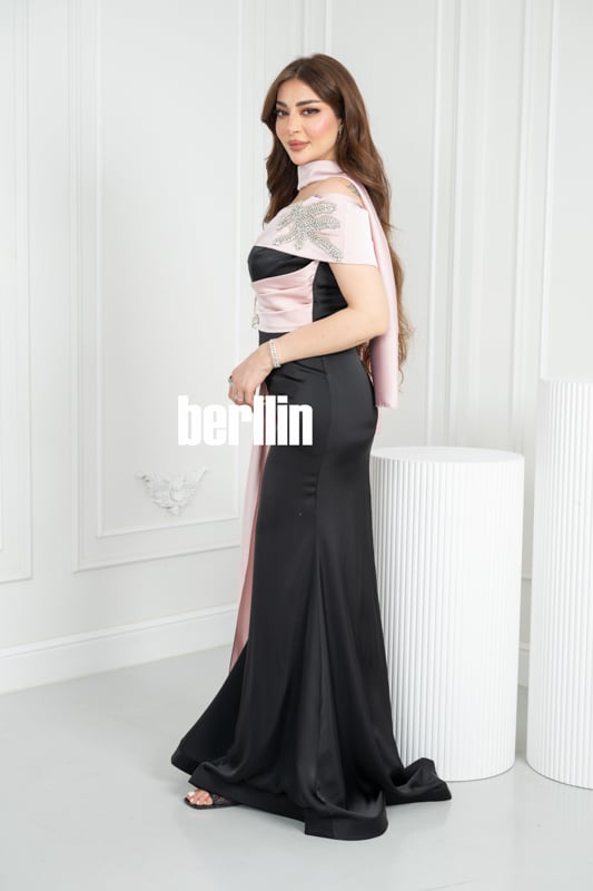 - فستان سهرة طويل يجمع بين الأسود الكلاسيكي بكريب فاخر ثابت القوام ووردي بودري حريري من الساتان اللامع، ما يخلق تباينًا مُبهِرًا ولمسة مخملية راقية.