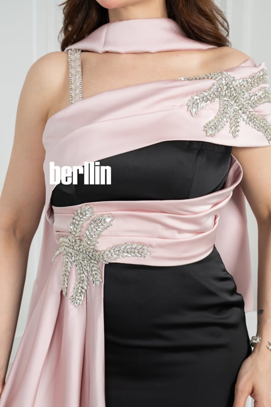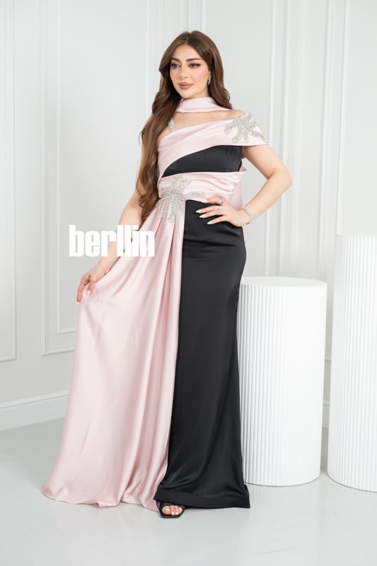 ينسدل الحرير الوردي كوشاح فجرٍ رقيق على ليلٍ أسود مخملي، فيلتقيان ليخطّا قصيدة تباينٍ آسرة. تتلألأ أوراق الكريستال على كتفك وخصرك كنجومٍ تنثر ضوءها على سماء صافية، ومع كل خطوة يهمس الذيل الوردي خلفك بقصة فخامة لا تُنسى.