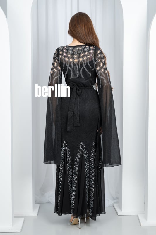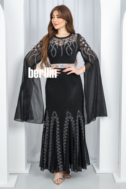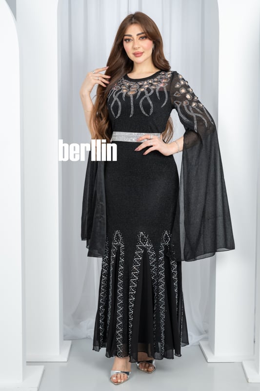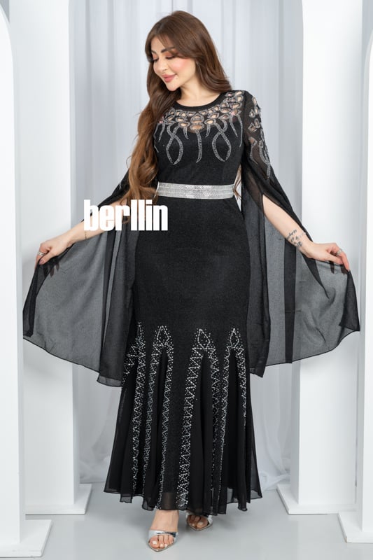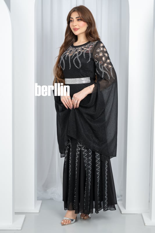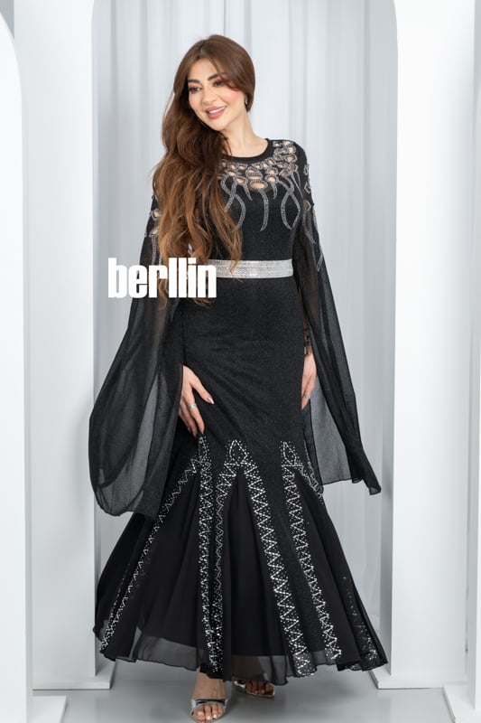 يتلألأ هذا الفستان الاسود كسماء ليلية مرصعة بالنجوم تنبض بخيوط فضية حول خصرك وتمتد في أجنحة شيفون تحلّق مع كل خطوة لتتركي خلفك أثرًا من السحر اللامع.