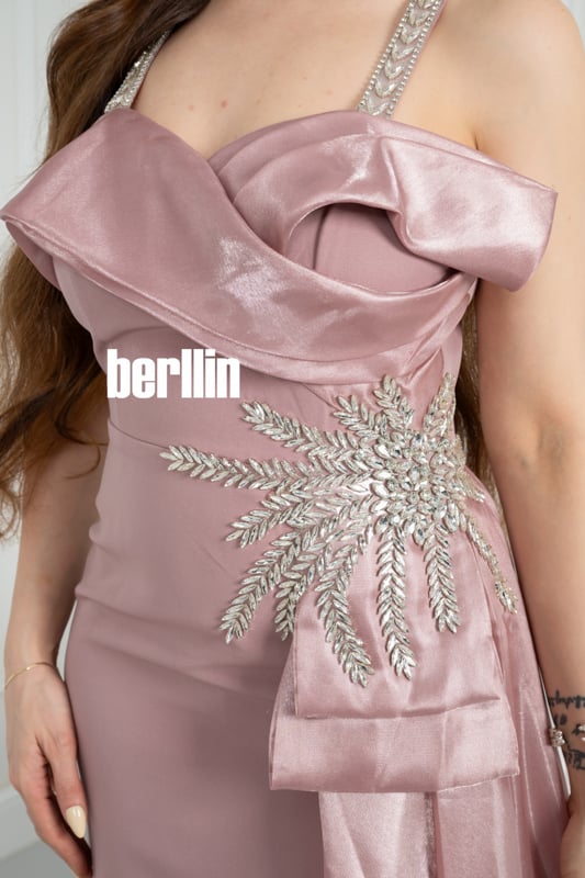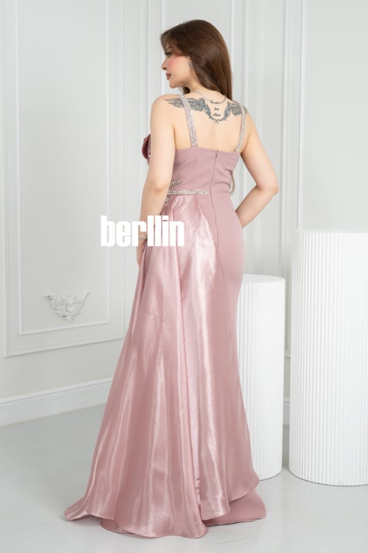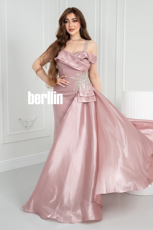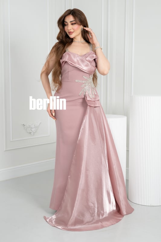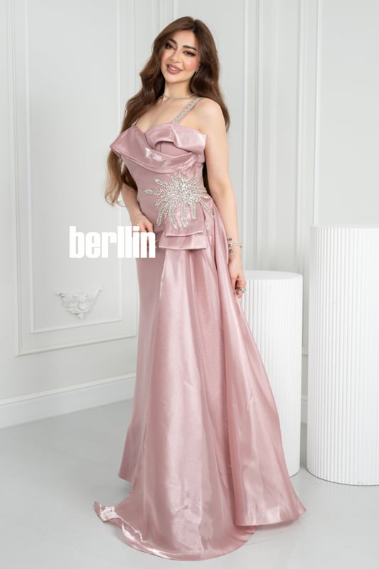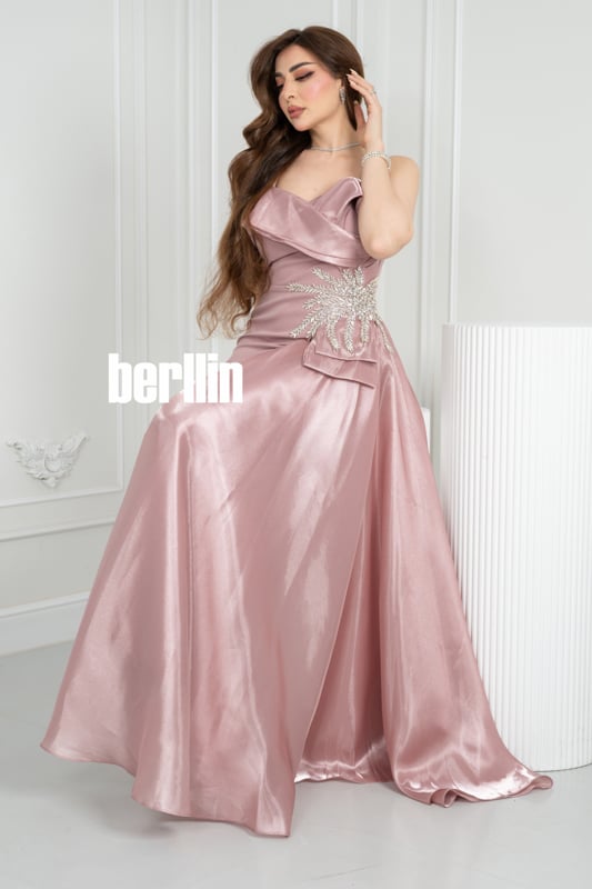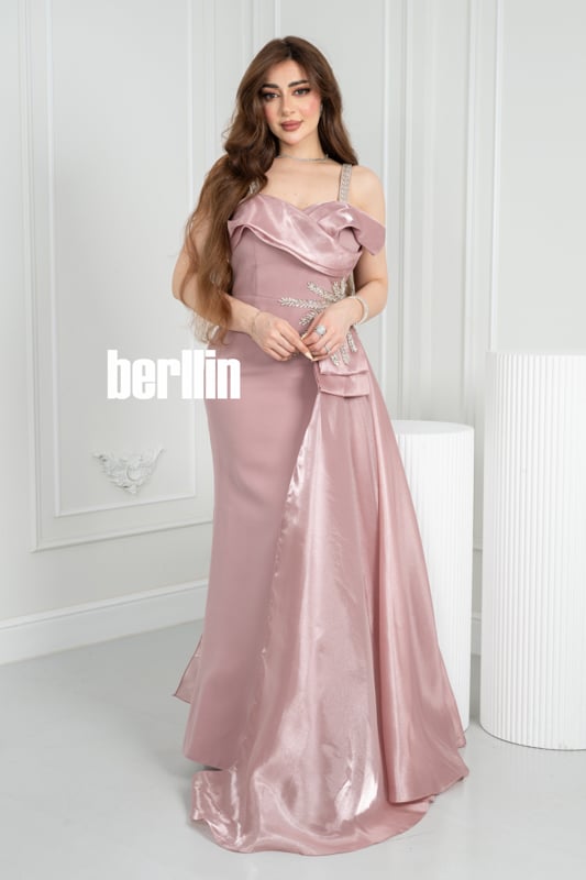 فستان سهرة طويل بلون وردي بودري هادئ، مصنوع من كريب فاخر يلتف بثبات حول القوام، تغلّفه طبقة ساتان لامعة تمنح لمعانًا حريريًا وانسيابية رقيقة.