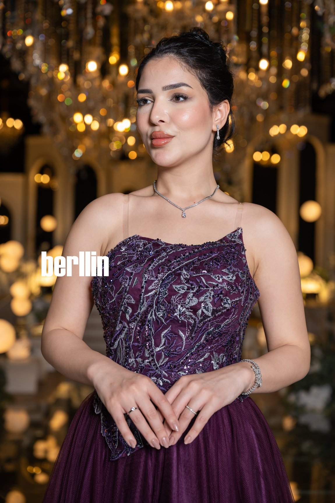 فستان سهرة طويل باللون العنابي العميق، يفيض فخامة وأناقة بفضل تصميمه الراقي. الجزء العلوي مصمم على شكل كورسيه أنيق مزخرف بتطريز فاخر من الكريستال وخيوط لامعة، مما يضفي لمسة براقة تتلألأ تحت الأضواء وتبرز جمال الصدر والخصر برسمٍ أنثوي متقن.