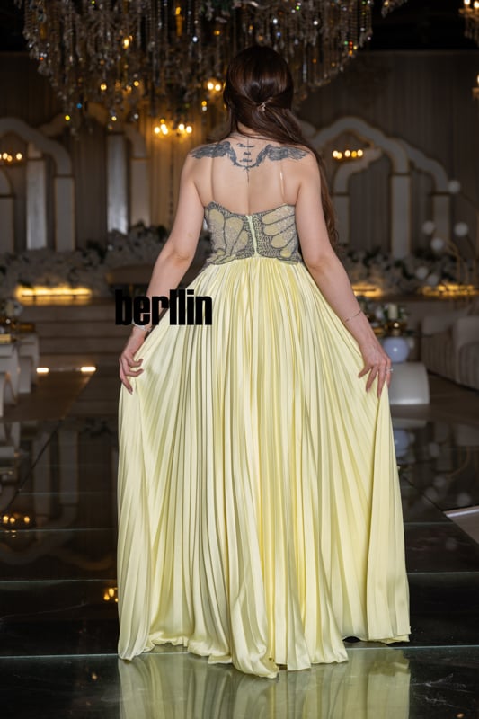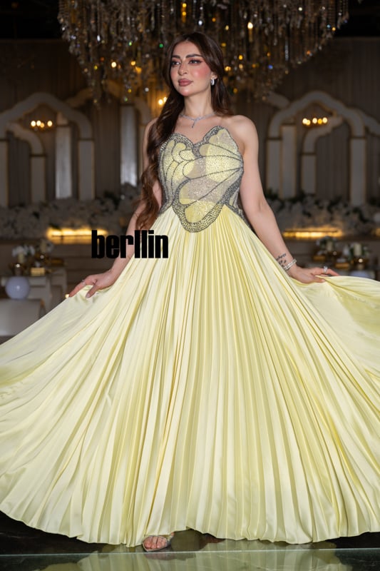 يمزج الفستان ثبات الكورسيه (بدون حمالات) مع سلاسة التنورة، ما يمنحك حرية حركة مثالية للرقص والتقاط الصور. اللمعان الكريستالي يلتقط الأضواء الخافتة والثريّات الملوّنة، فيما يعكس الأصفر الباستيلي نضارة بشرتك ويبرز ملامحك الطبيعية.