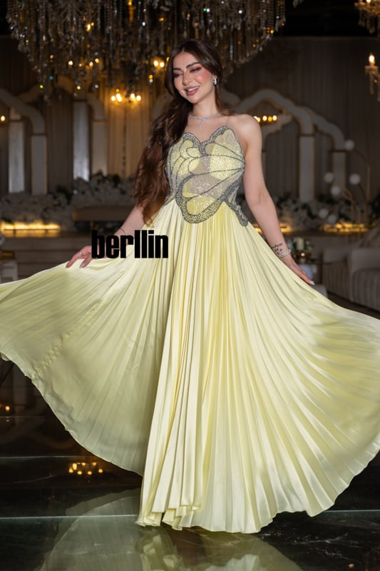 دع الضوء يهمس على ثناياكِ مع “فراشة الليمون”؛ فستان يجسّد رقة الجناح وقوة الإشراقة في آنٍ واحد. يلتفّ الكورسيه المطرّز حول قوامك كقطعة مجوهرات حيّة، بينما تنساب التنورة البليسيه بخفة نسيم الربيع مع كل خطوة. ارتديه، ودعي العيون تتبعك كفراشةٍ تنثر بريقها في سماء الاحتفال.