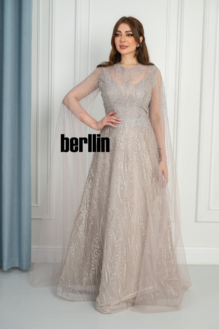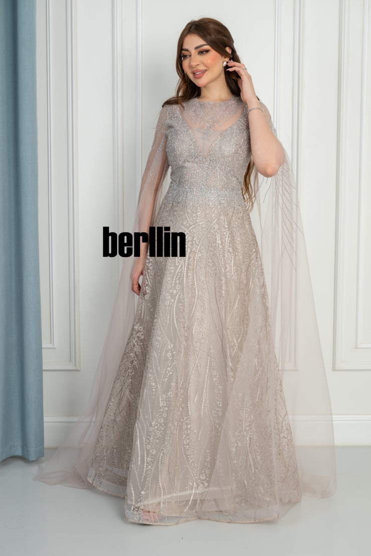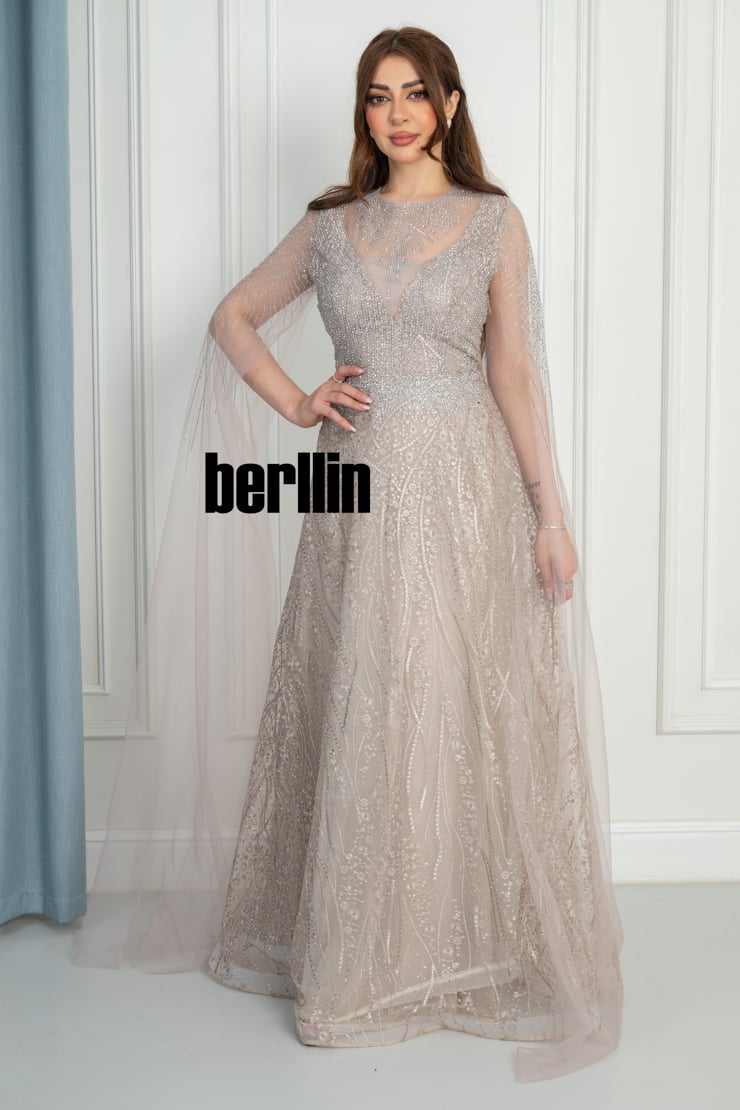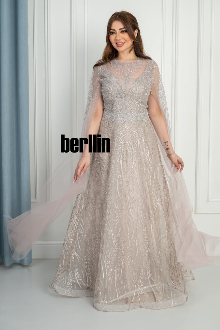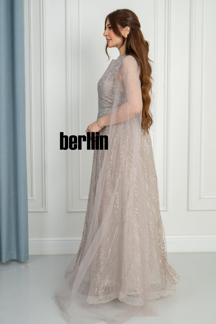 الفستان مصمّم من قماش شيفون راقٍ بطبقة من التول المطرّز بخيوط لامعة وكريستالات دقيقة تمتد على طول الفستان لتخلق تدرجاً بصرياً جذاباً يعكس الضوء برقة في كل حركة.
