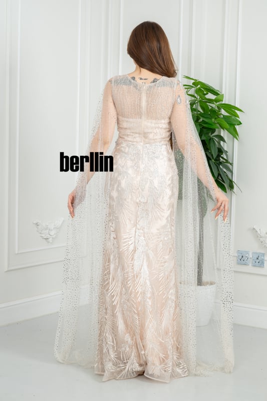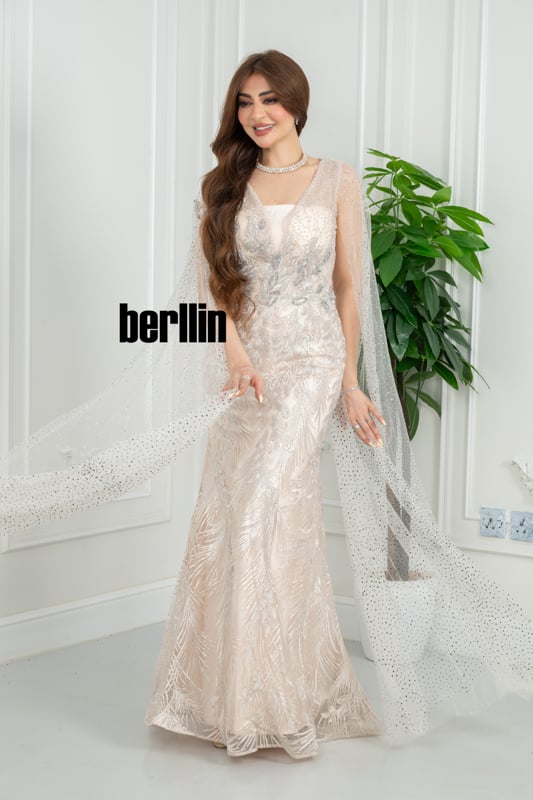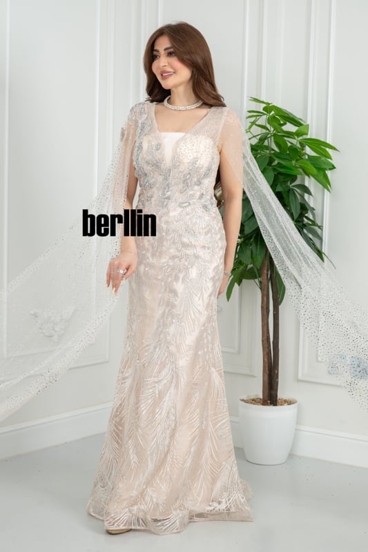 يتلألأ هذا الفستان الشامباني كقطرة ضوء انسكبت على ريشٍ ذهبي؛ ترفرف حولك طبقة الكاب المرصعة كذرات نجم، لتغلف إطلالتك بهالة بحرية آسرة لا تُنسى.
