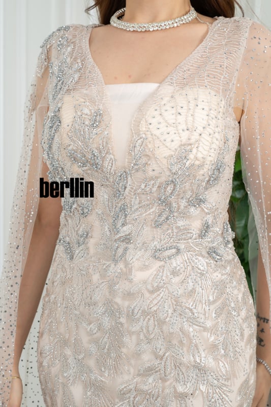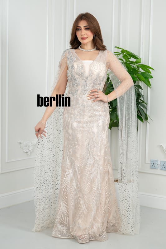 قصّة حورية تلتصق بالقوام حتى الركبتين ثم تتسع تدريجيًّا، مكسوّة بطبقة تول مطرّزة بريش فضي لامع يوحي بشلال ضوء. ينسدل من الأكتاف كاب تول شفاف مرقّط بكريستالات دقيقة حتى الأرض، فيلتف حول الذراعين بغلالة ضوئية متحرّكة. حزام معدني بلون الذهب الأبيض يحدّد الخصر ويوزّع البريق في المنتصف، بينما تمنح فتحة الصدر المربّعة بإطار تول شفّاف توازناً محتشماً مع فخامة التفاصيل.