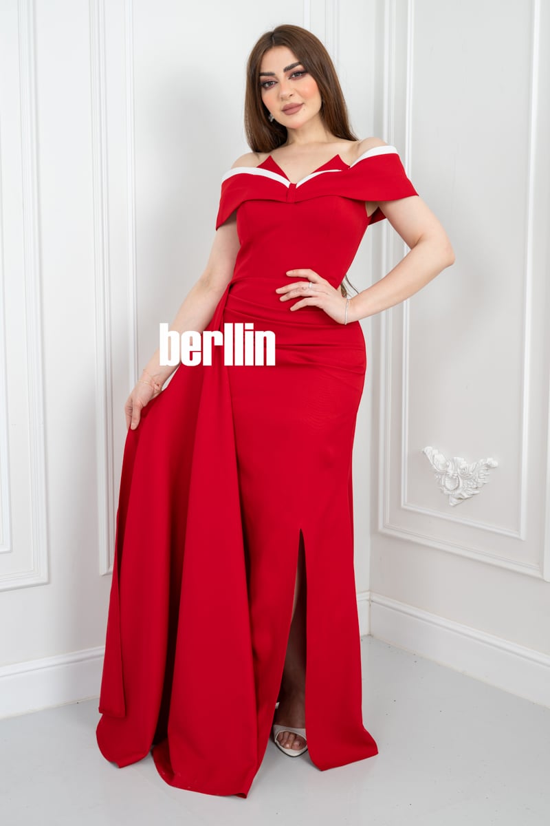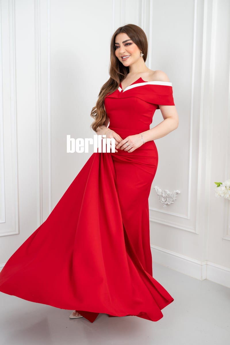 فستان أحمر ملكي بقصة أنيقة وأكتاف مكشوفة مزينة بحافة بيضاء، خصر مشدود، وفتحة أمامية جذابة تضيف لمسة راقية