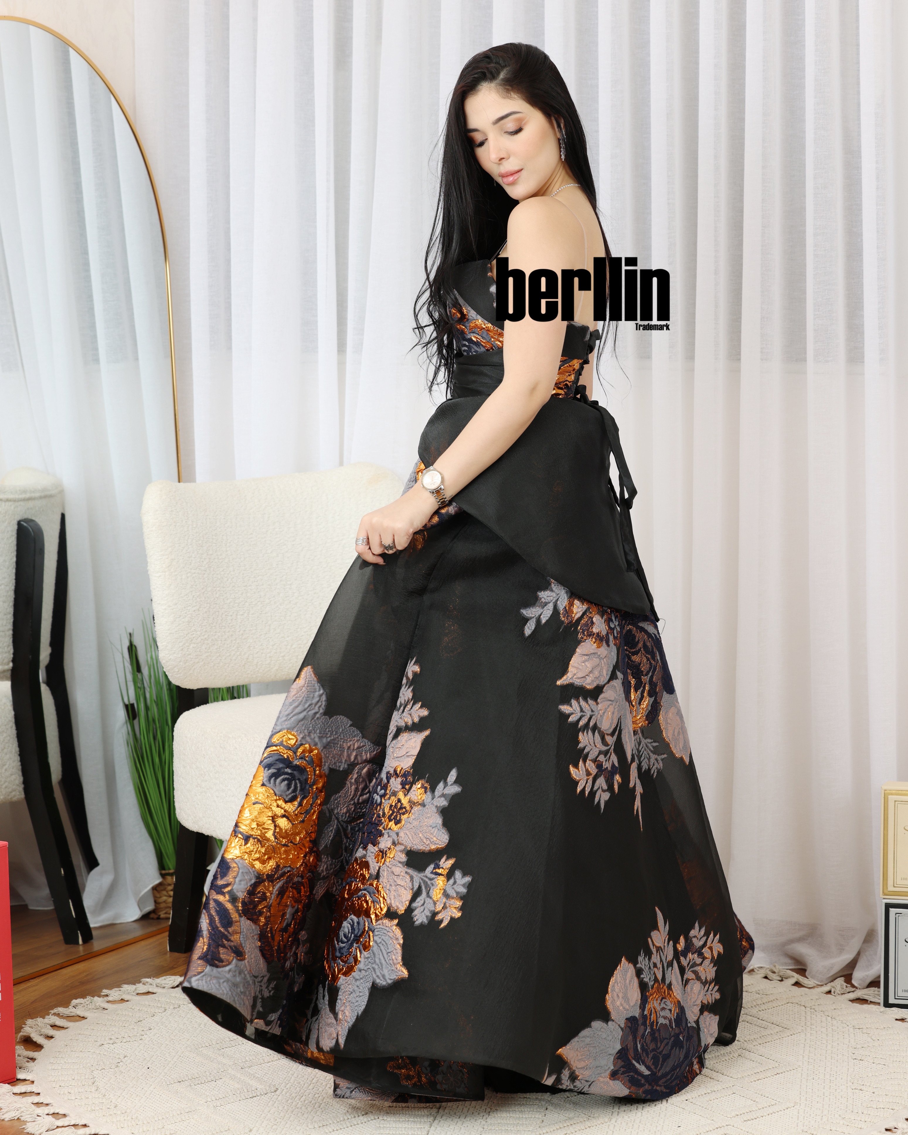 يتميز فستان الأسود السهرة من برلين بتوب سهرة منقوش بتذهيبة ذهبي لتضفي لمسة ساحرة على مظهرك في المناسبات الخاصة. ويأتي مصنوعًا من الجازار الفخم مسامي يمنحك إطلالة راقية عند تنسيقه مع مجوهرات وحذاء بكعب مرتفع وسيور.