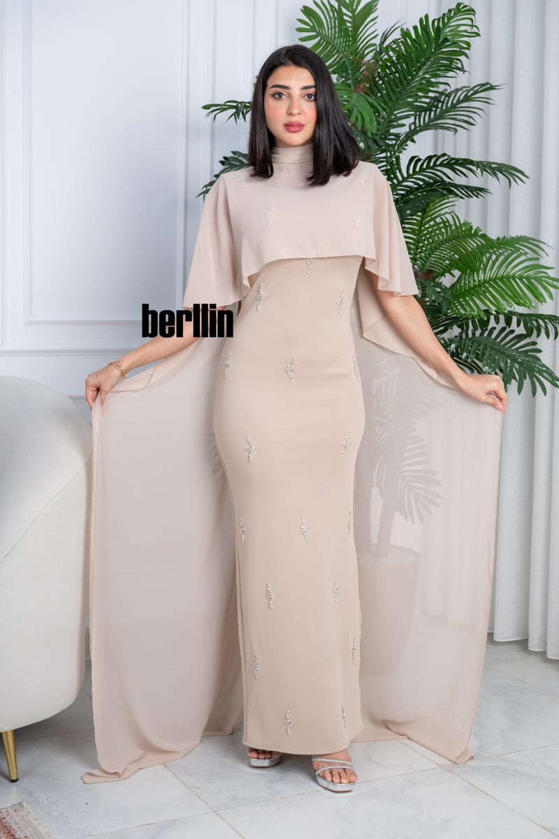 - الأكمام: يتميز بأكمام كاب واسعة تنساب برقة فوق الأكتاف، ما يضيف لمسة من الفخامة والرقي ويمنحك إطلالة ملكية فاخرة.
