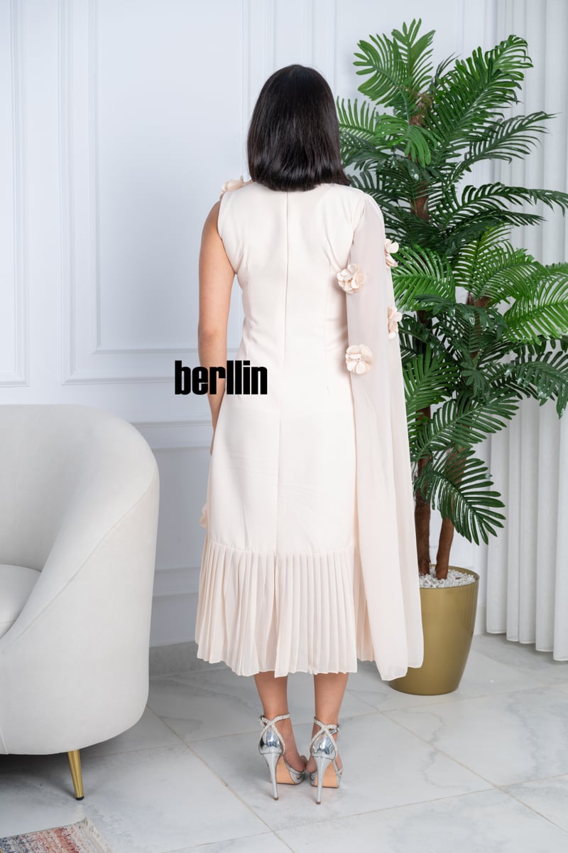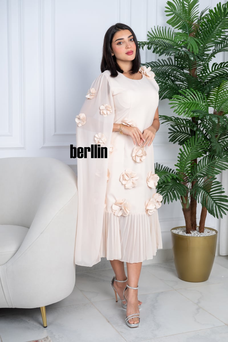 * الجزء السفلي من الفستان يتميز بطبقة كسرات (Pleated Hem) ناعمة، تمنحه مظهراً انسيابياً وأنيقاً عند الحركة.