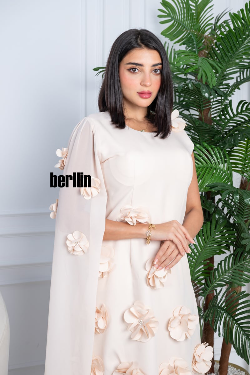 * الفستان مزين بورود بارزة منتشرة على طوله، مما يعزز من جماله ويضفي عليه لمسة فاخرة.