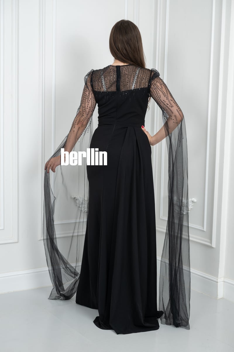 - أكمام كيب طويلة شفافة مزينة بتفاصيل دقيقة تضيف لمسة درامية راقية.