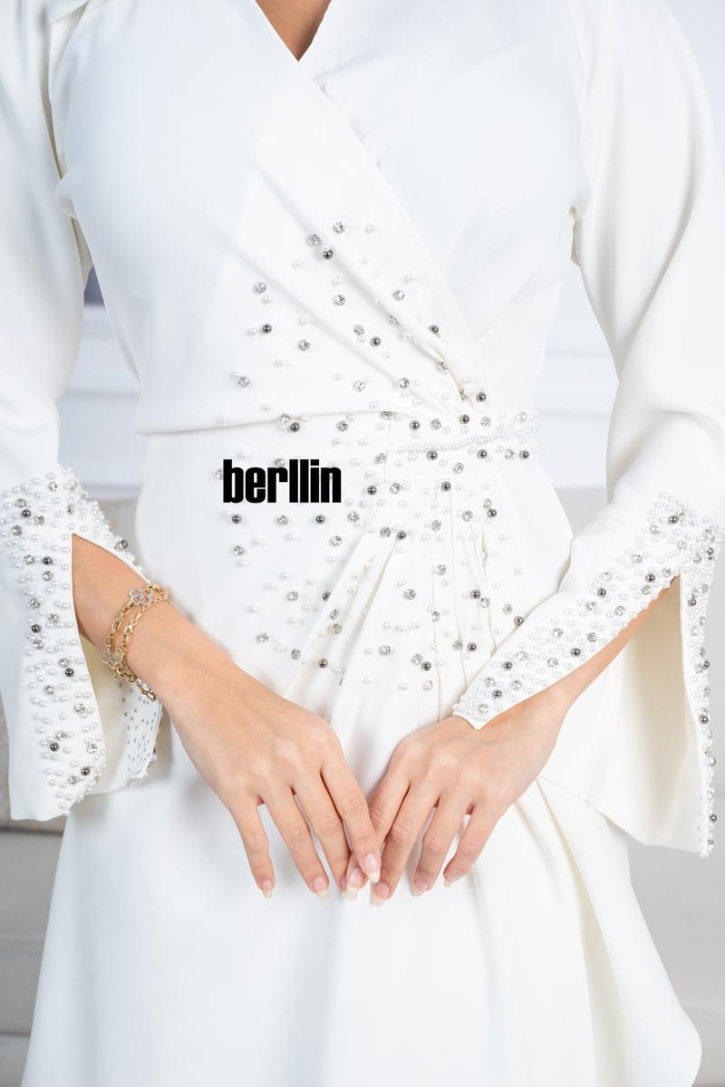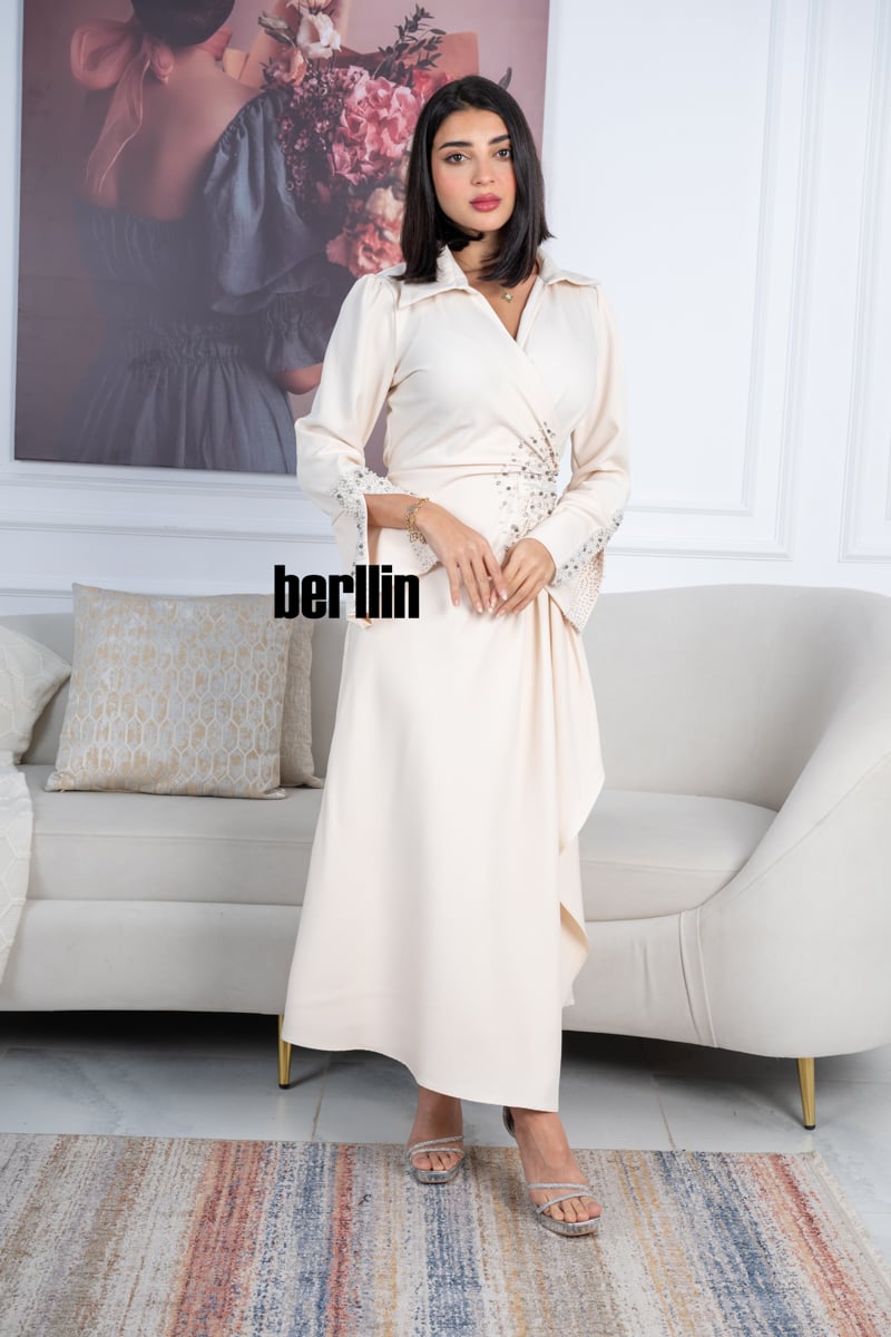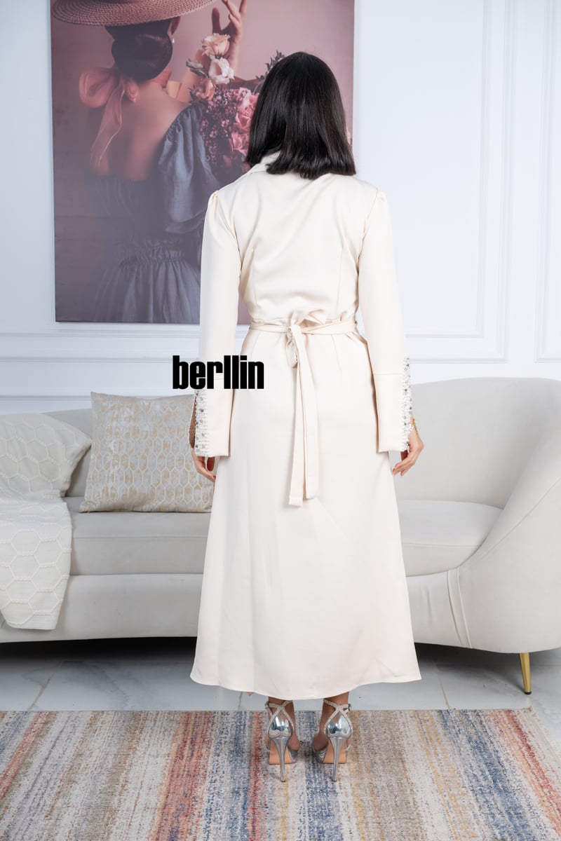 الأكمام طويلة ومزينة بتطريزات لؤلؤية عند الأطراف، مع فتحة تمنحها حرية وانسيابية في الحركة، مما يعزز من فخامة التصميم ويضفي طابعًا عصريًا أنيقًا.