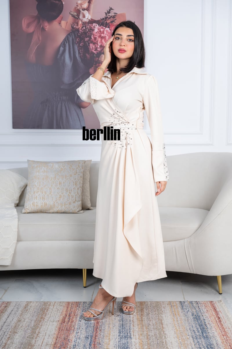 التصميم يعتمد على أسلوب الـ Wrap (القصة الملفوفة)، حيث يلتف القماش حول الجسم ليبرز الخصر بطريقة أنيقة وجذابة. وتزداد فخامة الفستان بفضل التطريزات اللامعة الموزعة على جهة الخصر على شكل أشعة متفرقة، مما يضيف لمسة من البريق والتألق.