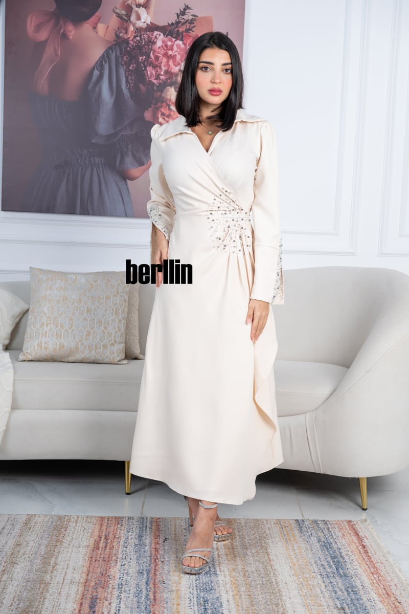 يتميز بتصميم أنيق وراقي بلون أبيض ، ما يمنحه لمسة ناعمة وأنثوية. يأتي بقصة طويلة وانسيابية، مما يعزز من الإطلالة الفاخرة ويضفي شعورًا بالرقي والكلاسيكية.