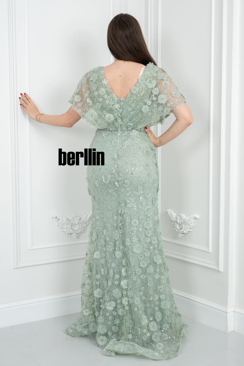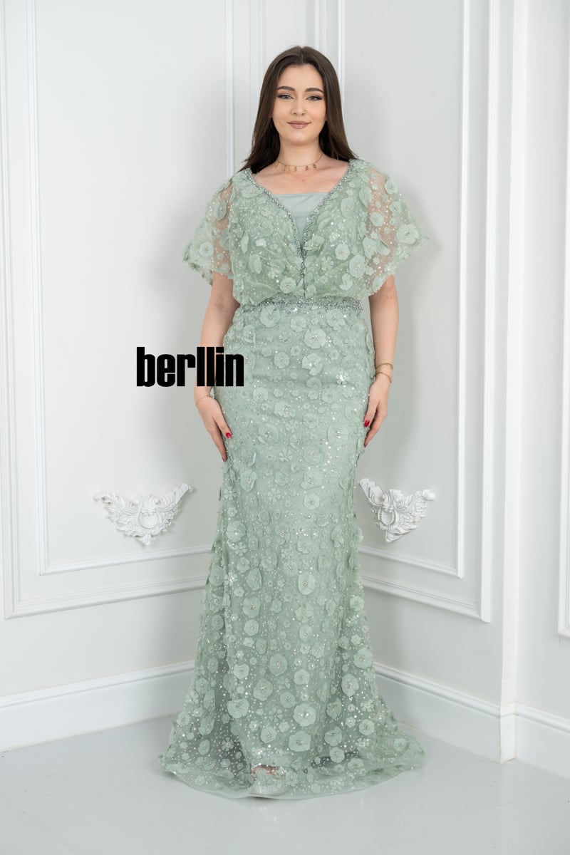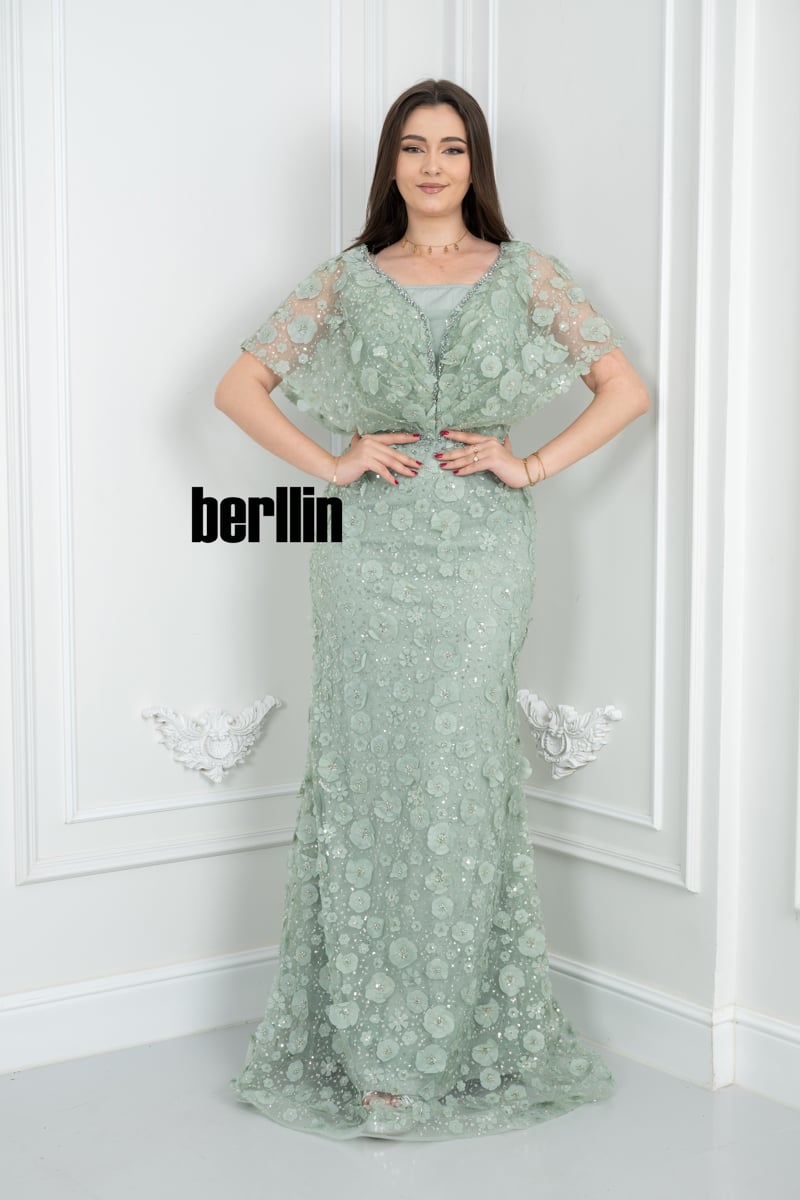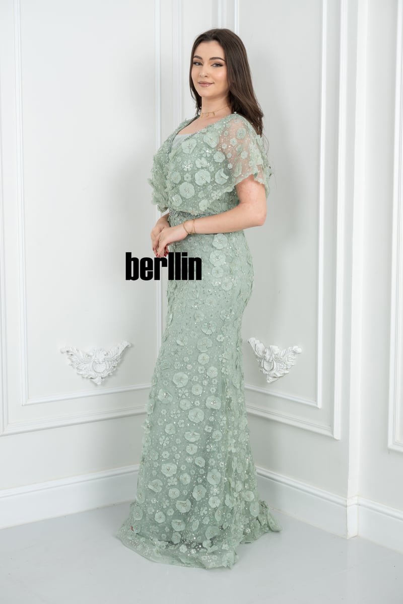 فستان سهرة فاخر بتصميم ملكي مذهل باللون التيفاني الفاتح، يعكس الفخامة والرقي بأدق تفاصيله.