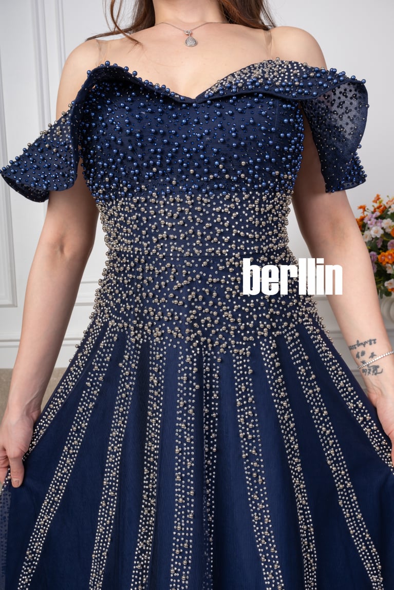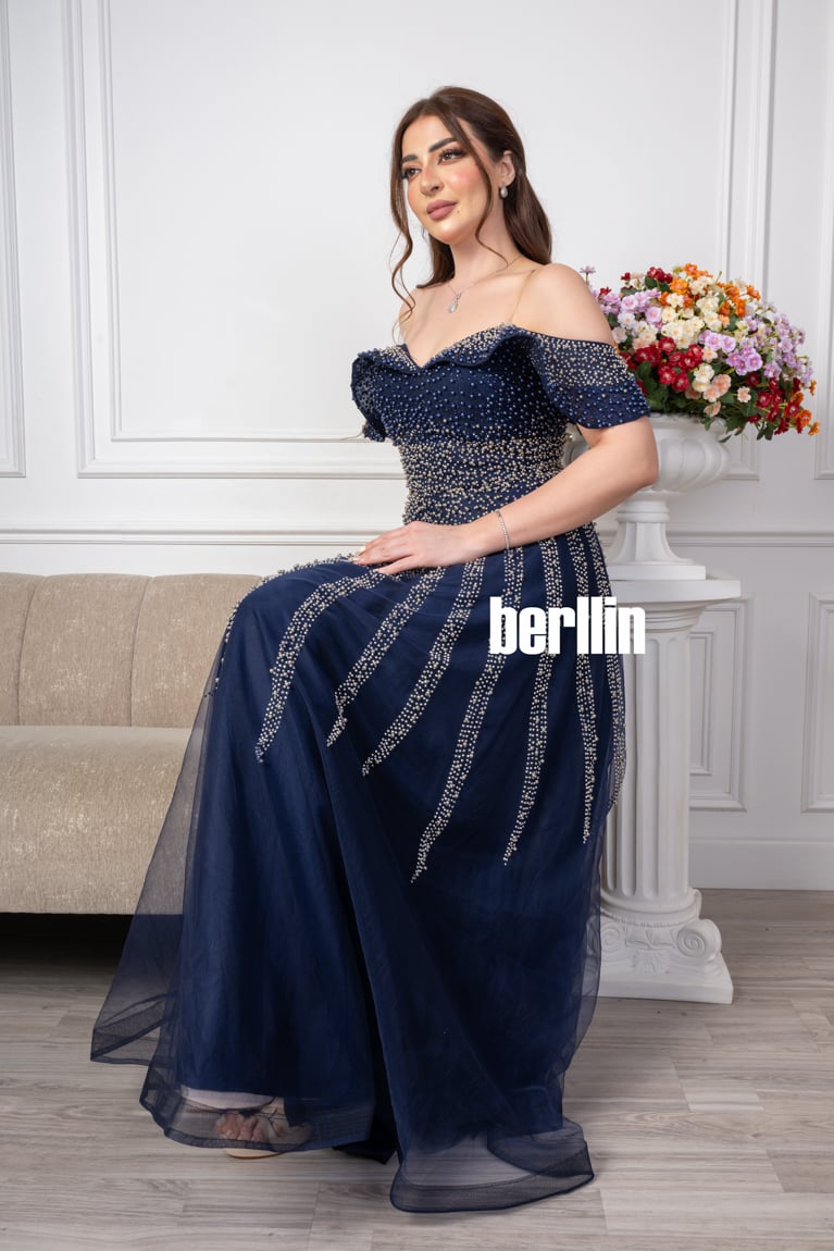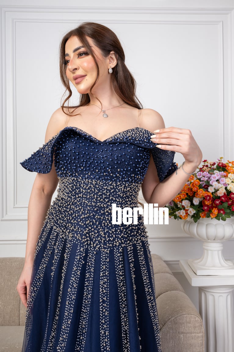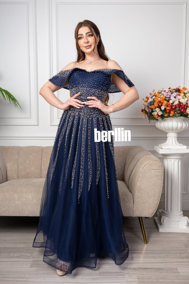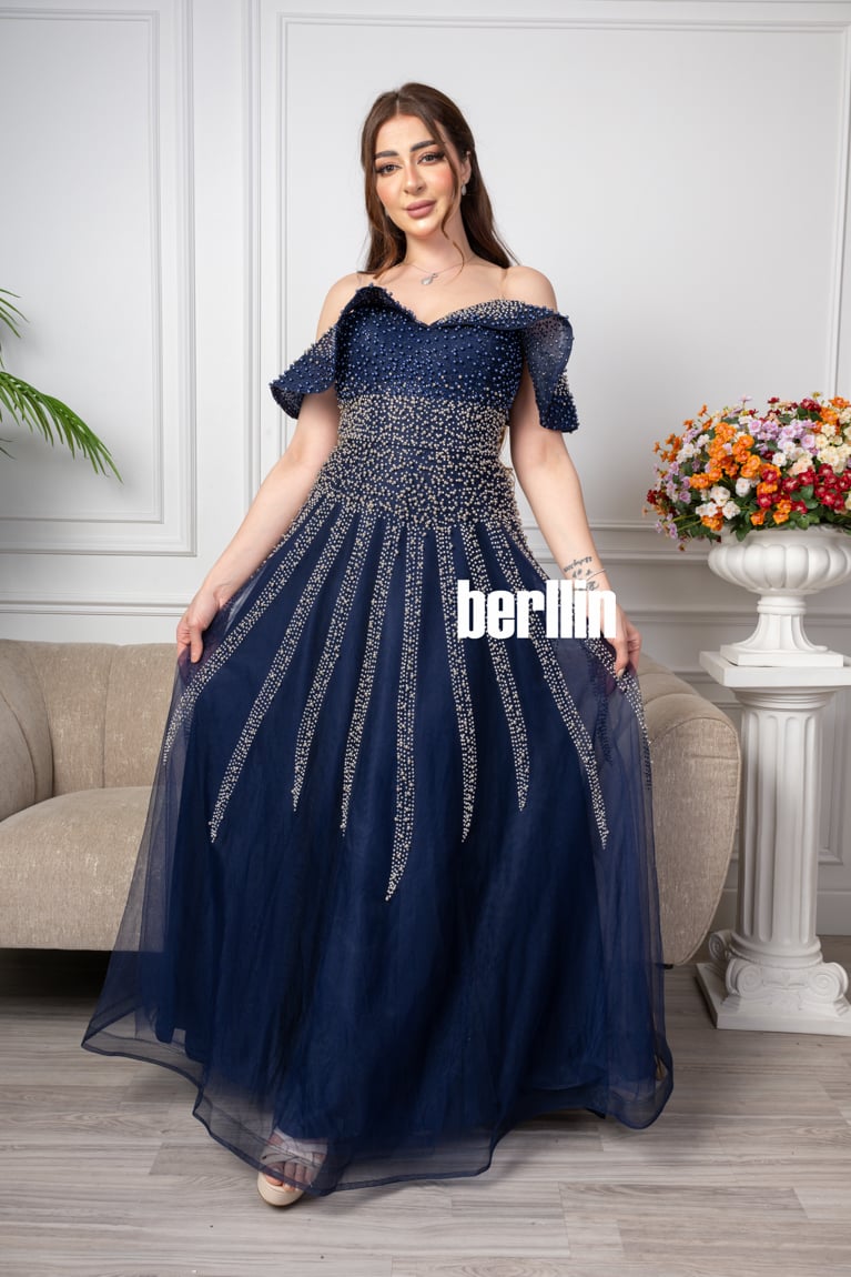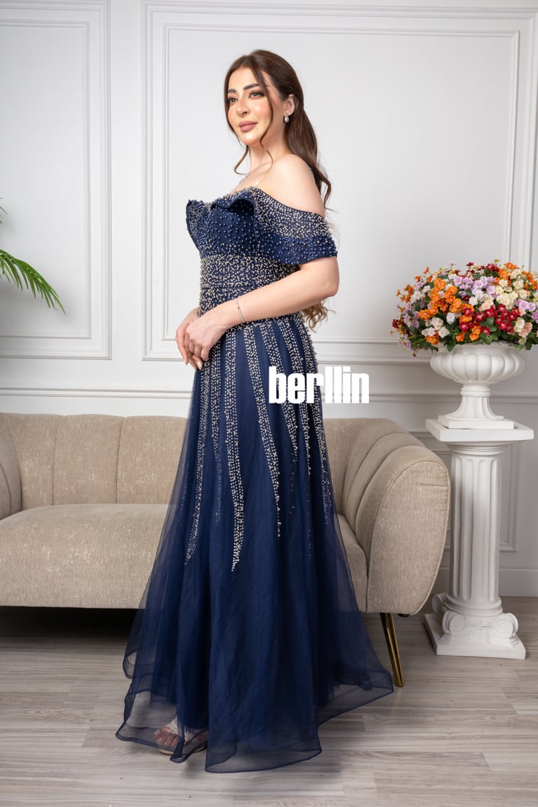 اكتشفي فستان طويل سهره اوف شولدر بلمعة الؤلؤ لون كحلي رائع وقصة كلوش مميزة بالولو العصرية. مثالي لإطلالة أنيقة ومتوفر بجميع المقاسات.