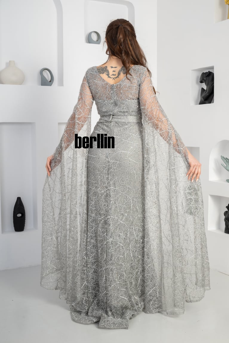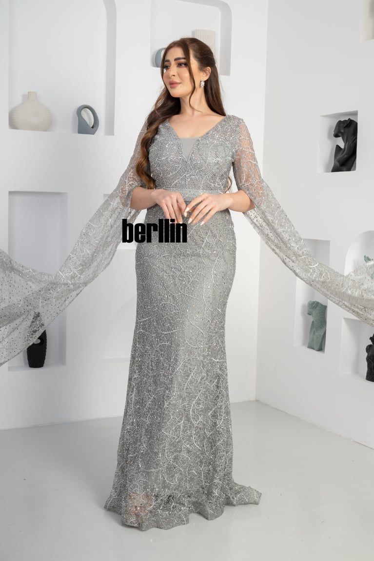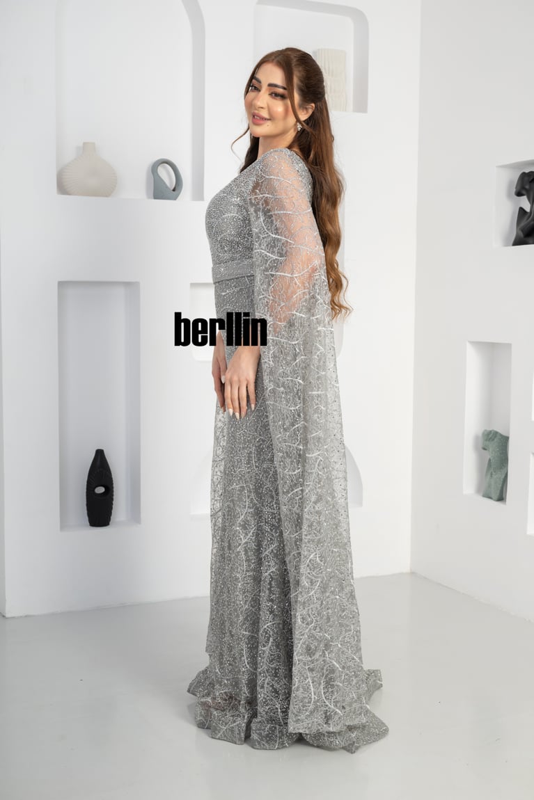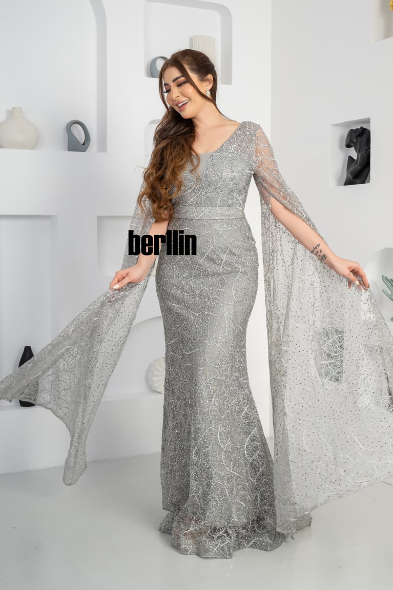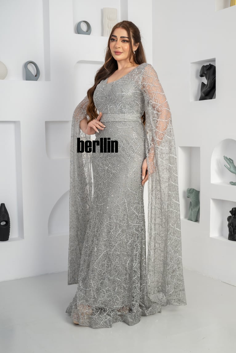 نوع التصميم: فستان سهرة مزين بالفصوص بأكمام كيب لون رصاصي