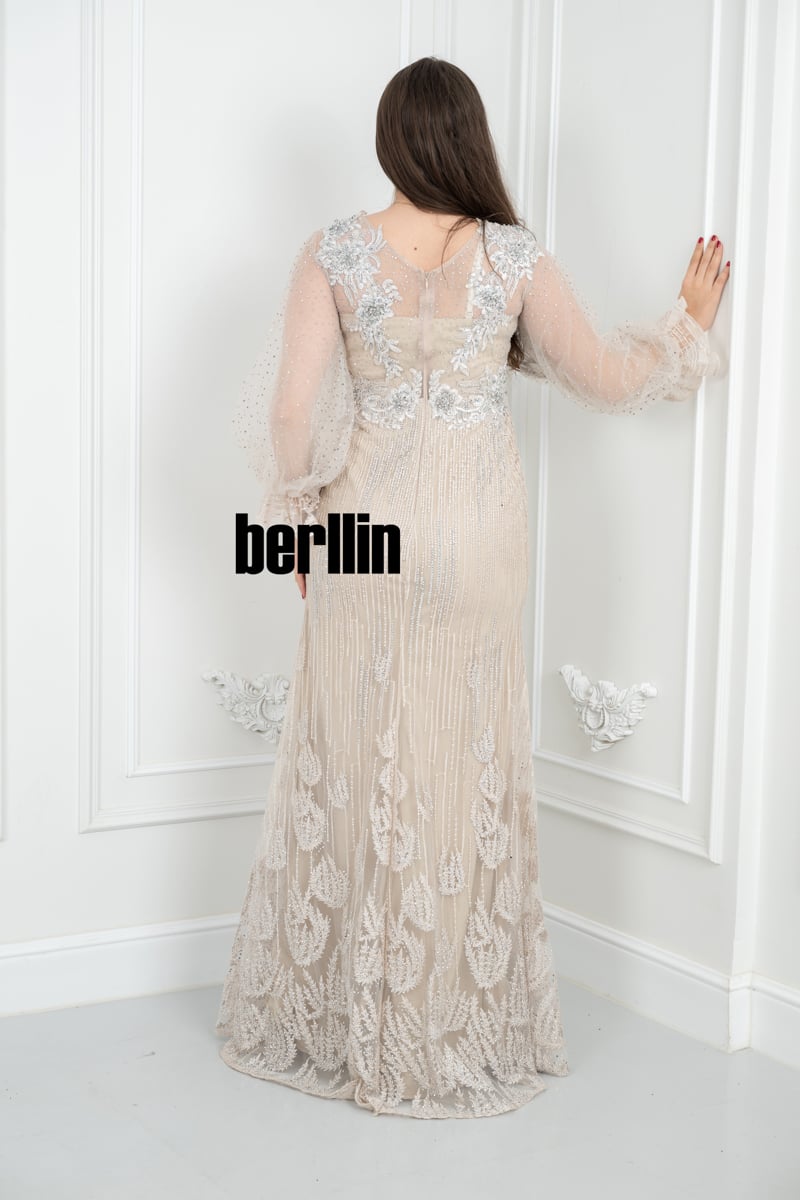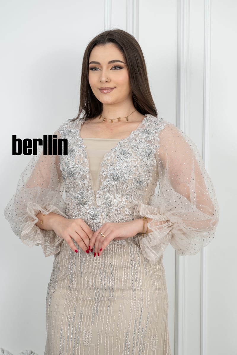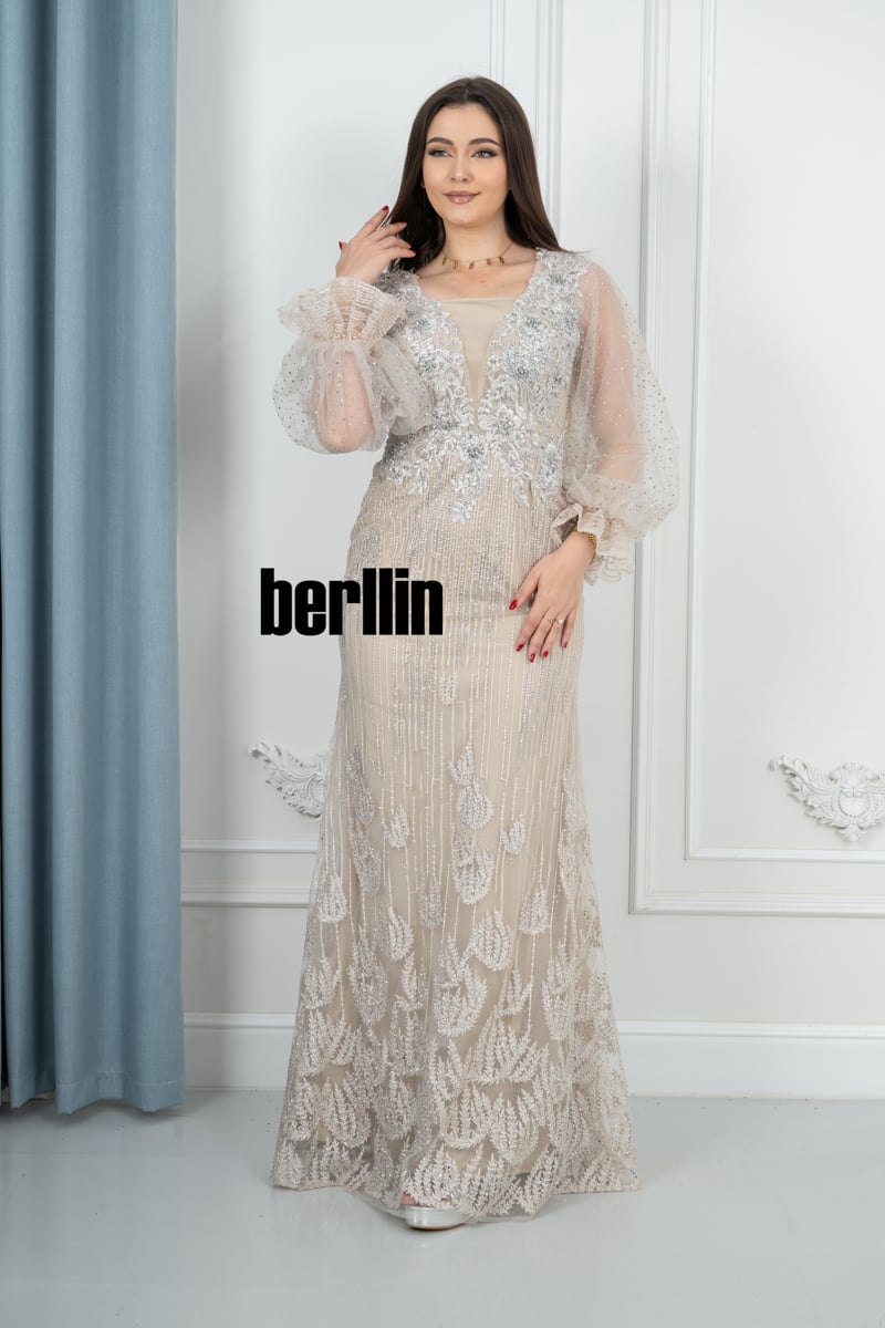 🔹 الأكمام: أكمام شفافة واسعة ومنفوخة بأسلوب عصري، مزينة بتطريزات ناعمة لمزيد من الأناقة والرقي.