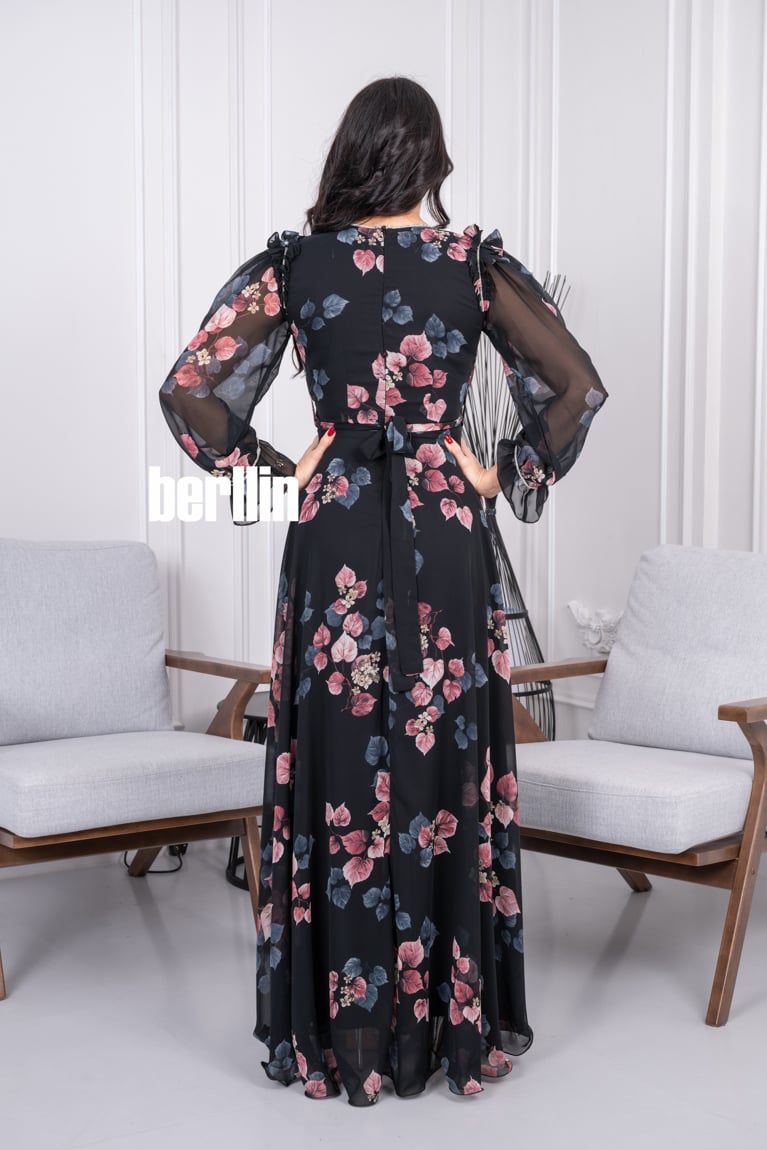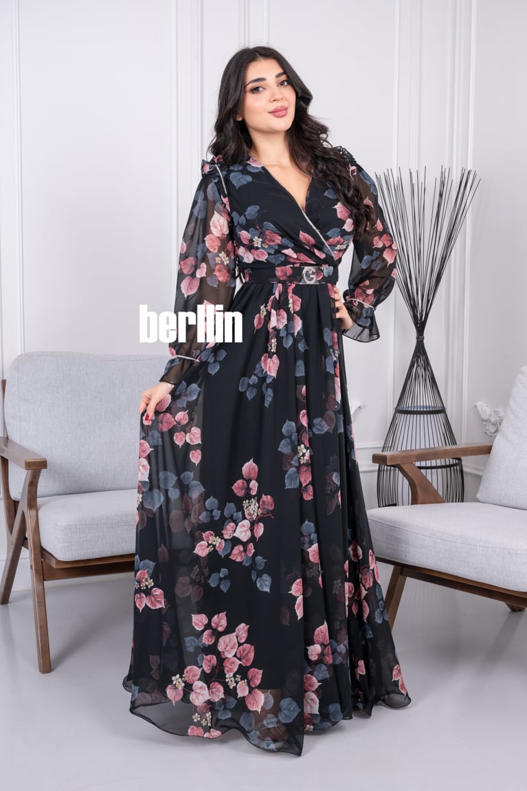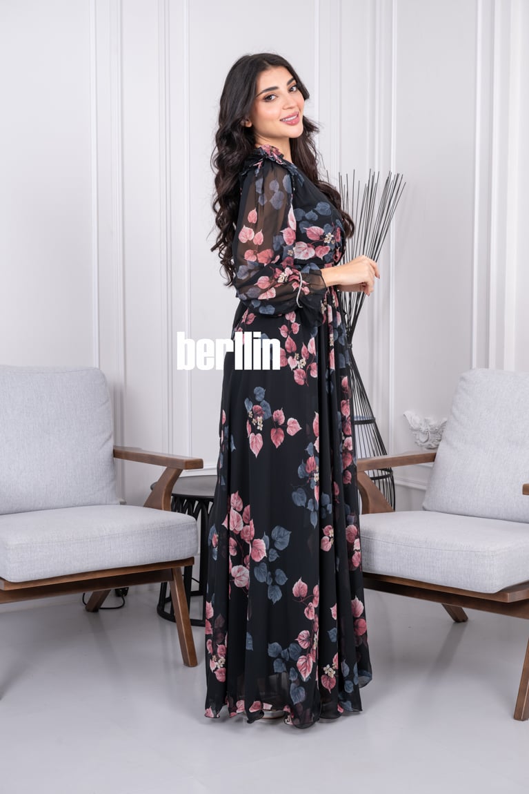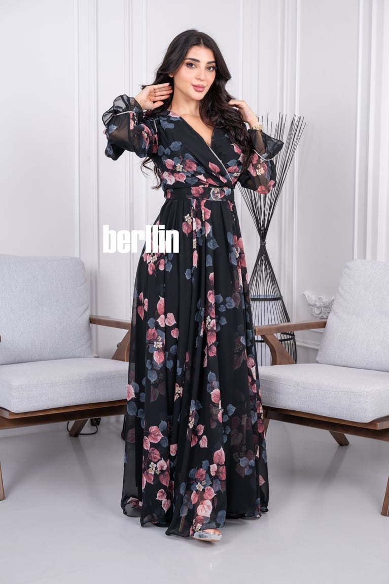 يعكس هذا الفستان الصيفي الطويل من برلين شغف الماركة بالزهور الزهية واللمسات الرومانسية. صنع الفستان من شيفون فاخر مع قصة صدر لف انيقة تبرز جمال قوامك، وينسدل إلى حافة بطول الكاحل.