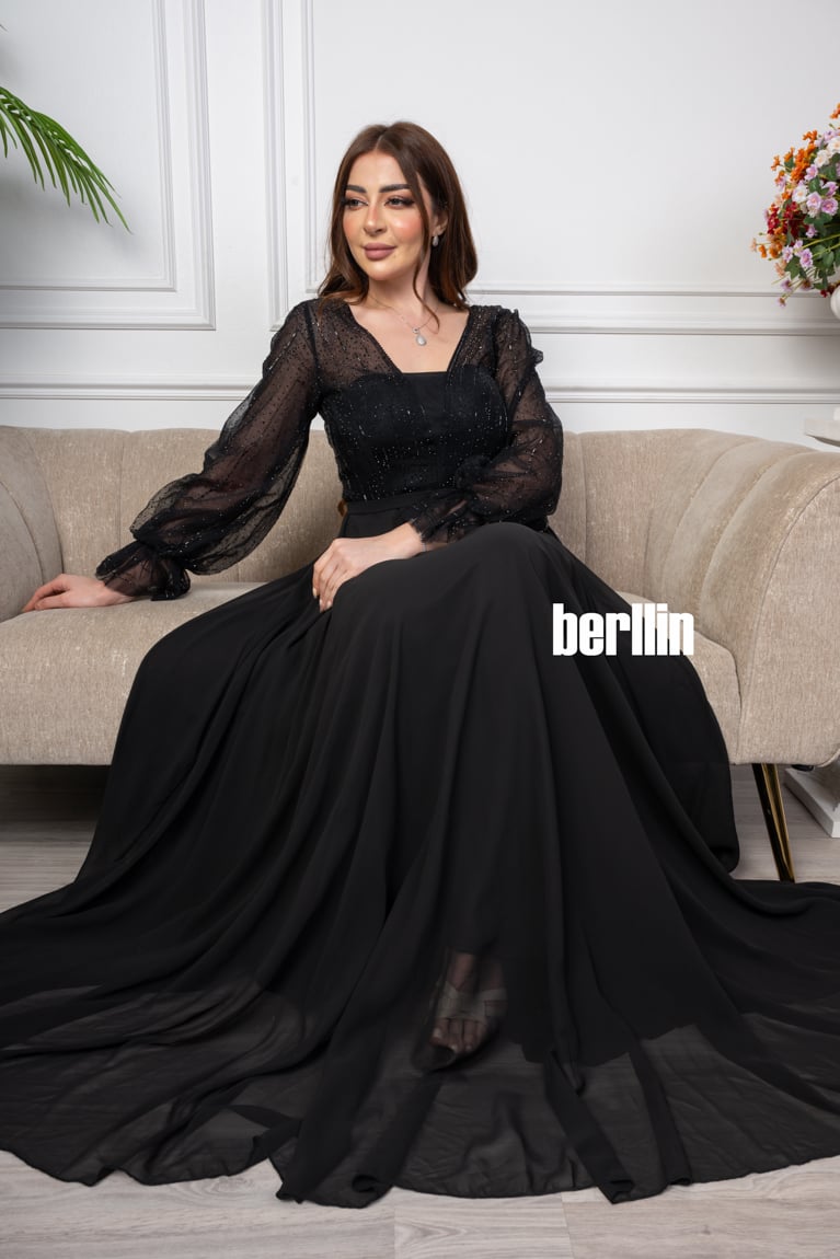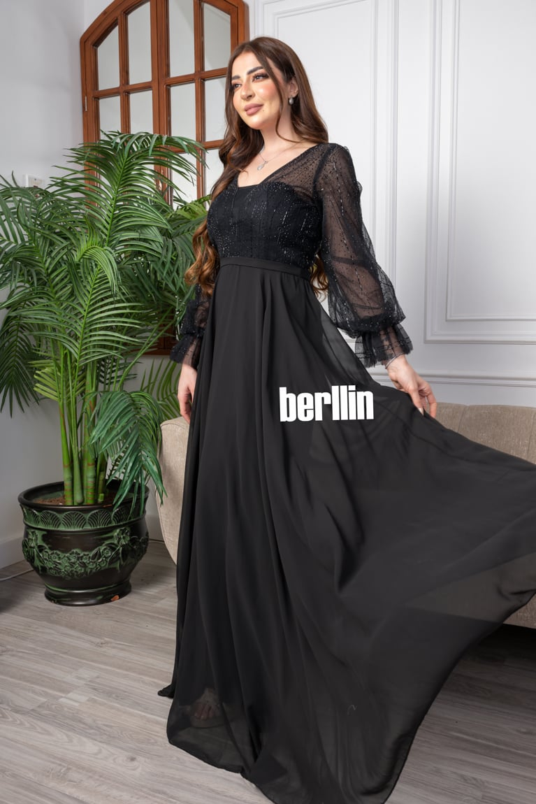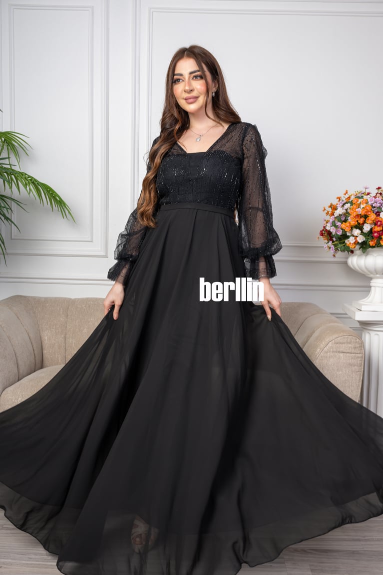 اكتشفي فستان سهرة طويل شيفون مزين بالترتر لون اسود رائع وقصة عصرية. مثالي لإطلالة أنيقة ومتوفر بجميع المقاسات.