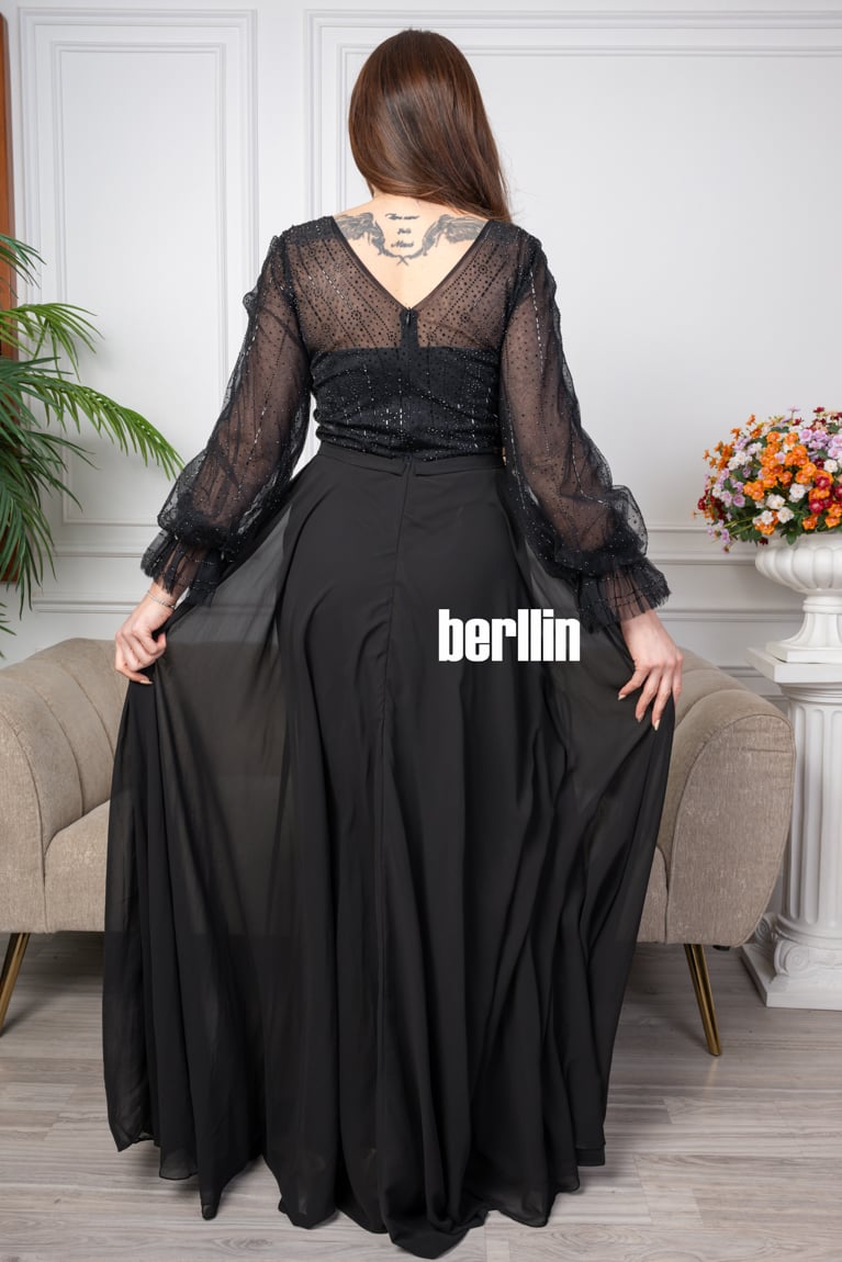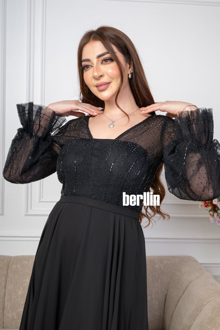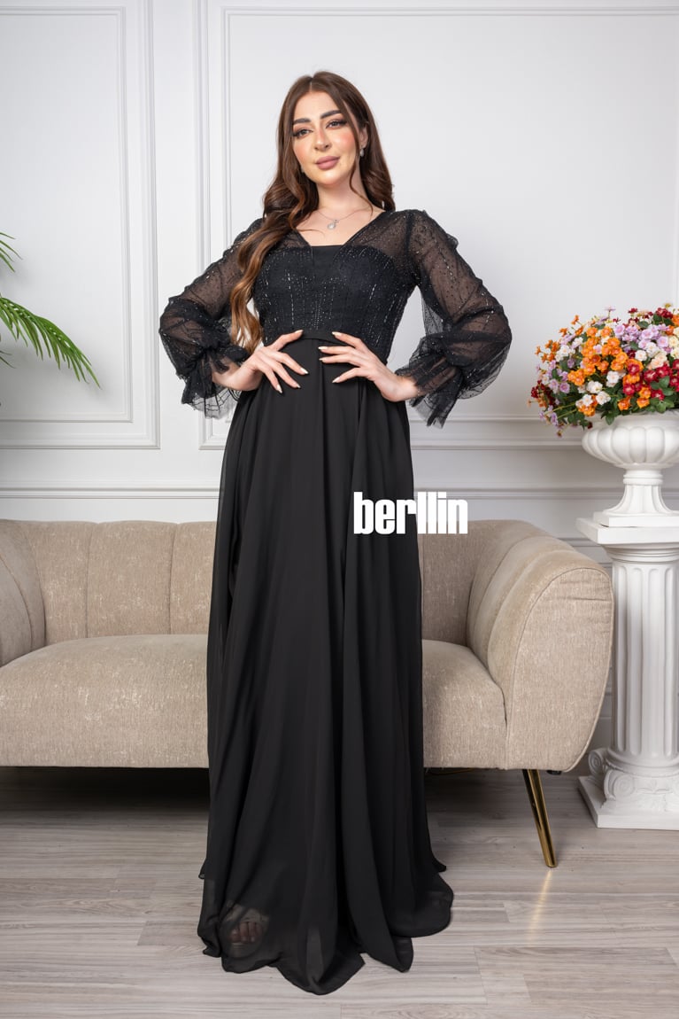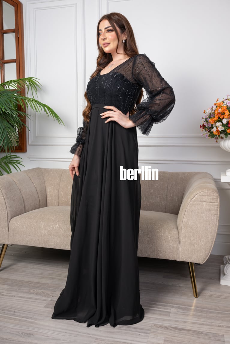 اكتشفي فستان سهرة طويل شيفون مزين بالترتر لون اسود رائع وقصة عصرية. مثالي لإطلالة أنيقة ومتوفر بجميع المقاسات.