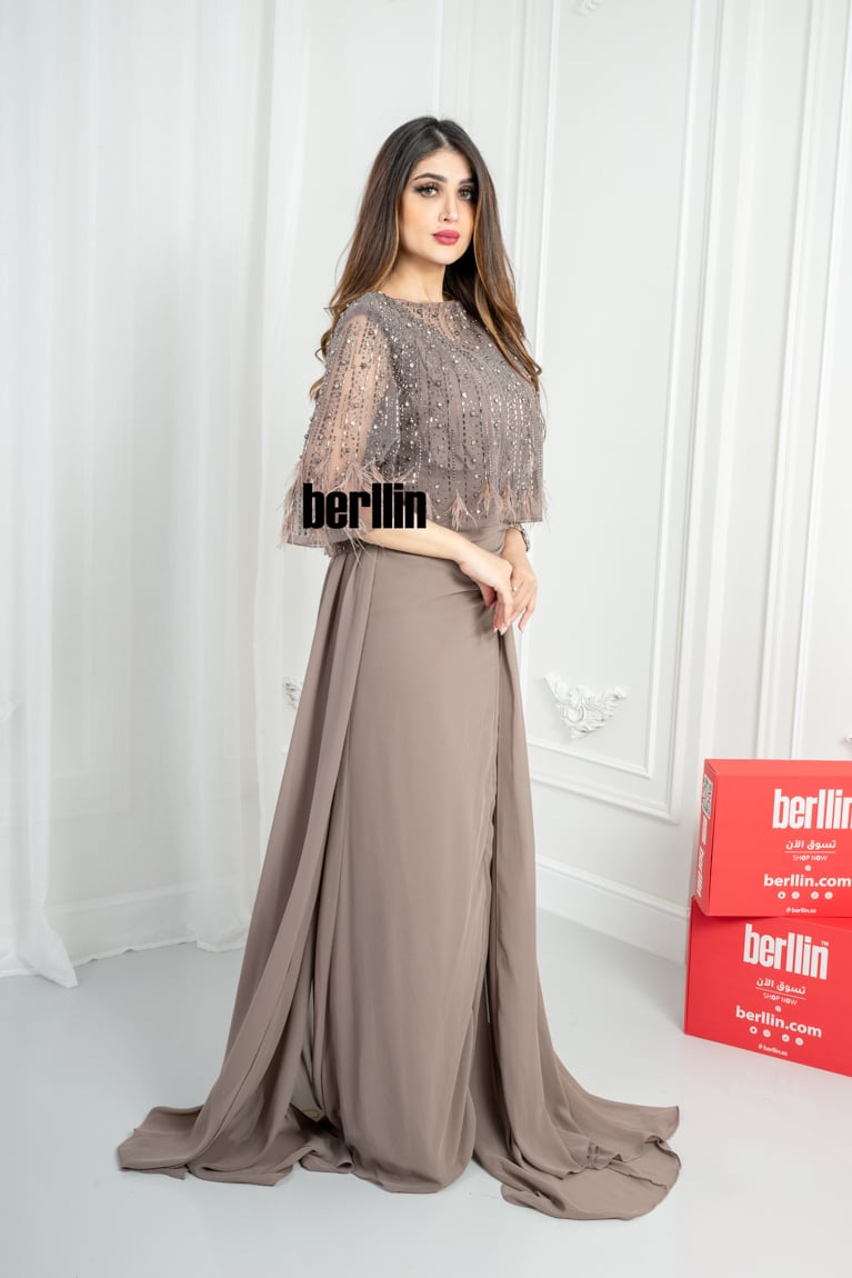 استعدي لتلفتي الأنظار مع هذا الفستان البني الطويل من برلين، المصمم خصيصًا للسهرات والمناسبات الخاصة. يتميز بتزيينات راقية من الريش والفصوص تمنحه لمسة فاخرة تواكب أحدث صيحات الموضة. قصة الفستان العصرية مع الياقة العالية والخصر الضيق تبرز القوام بأنوثة وأناقة، بينما يضفي قماش التول الخفيف انسيابية جذابة على الإطلالة.