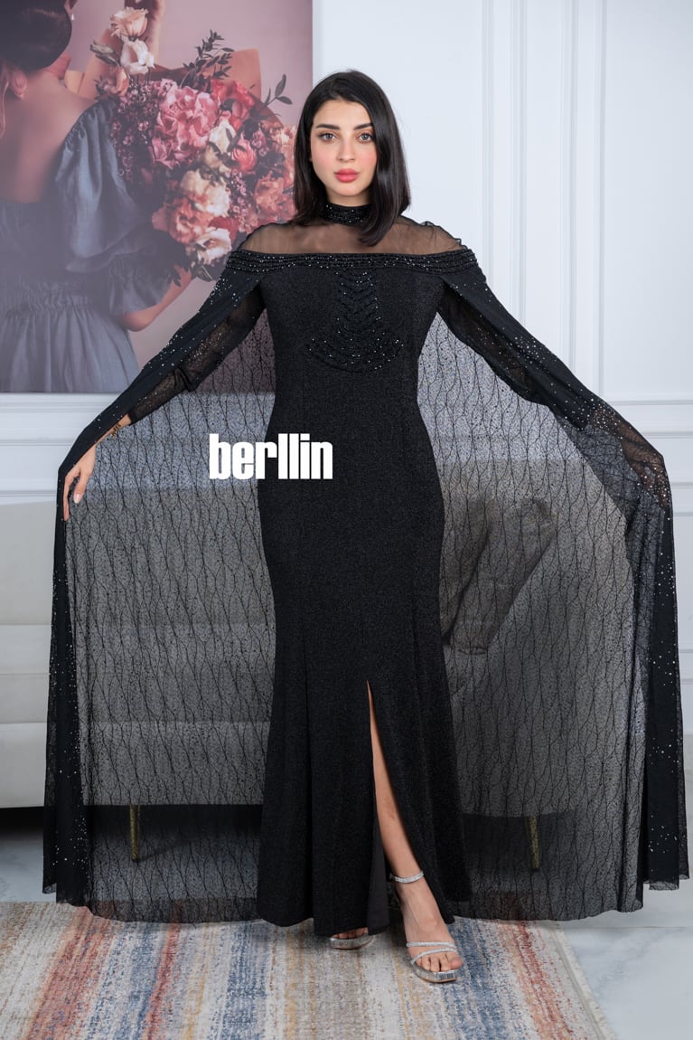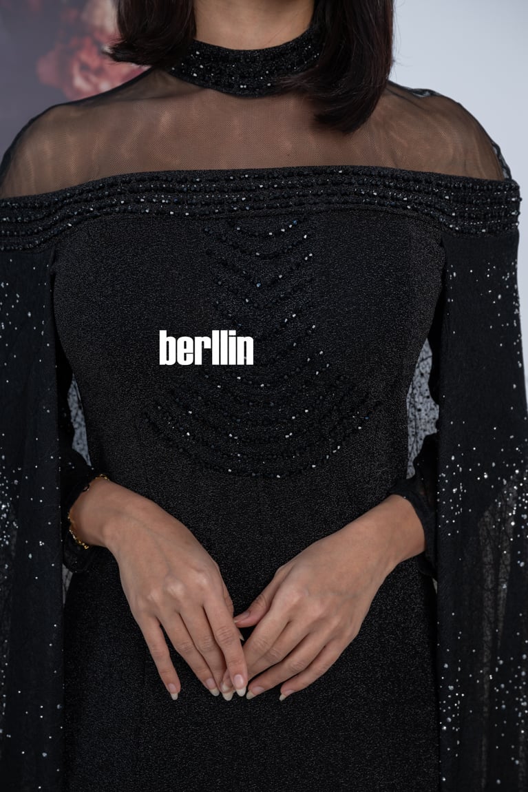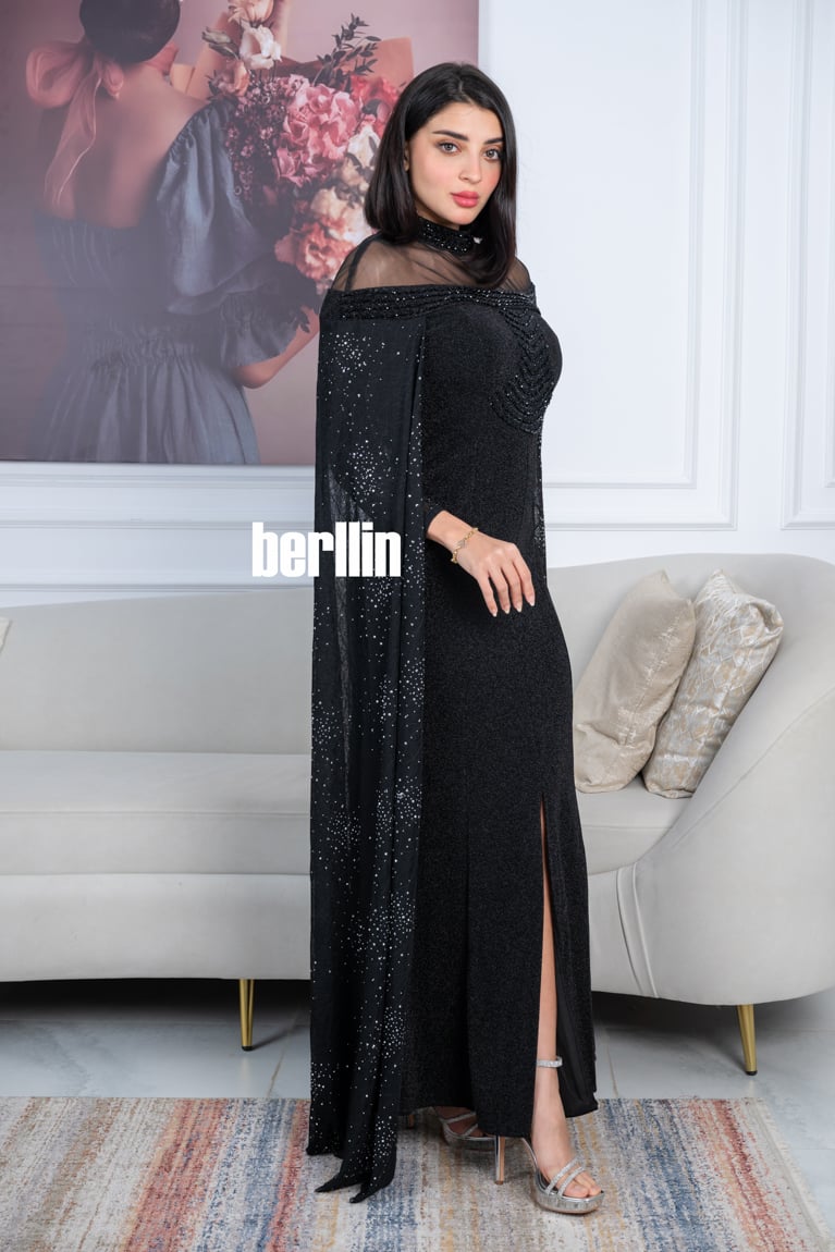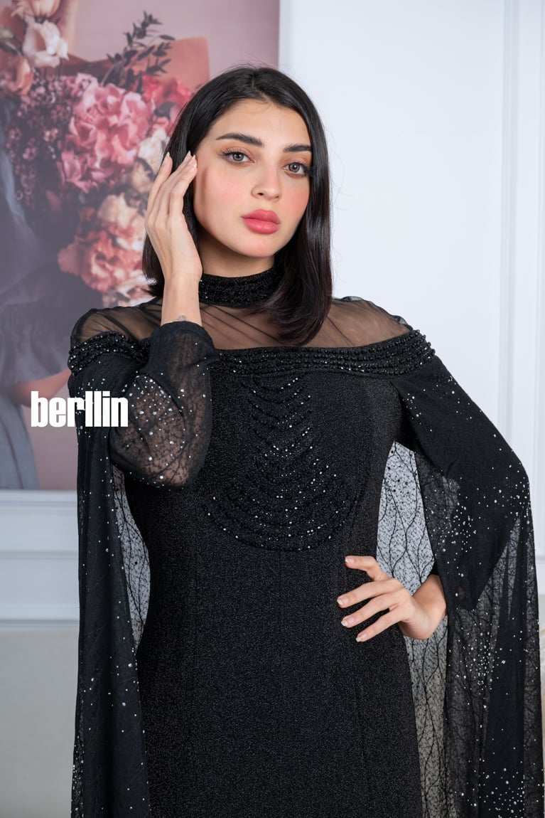 - القماش: خامة سوداء لامعة تضيف بعدًا فخمًا، مع تفاصيل دقيقة من اللمعان الموزع بشكل متناغم.