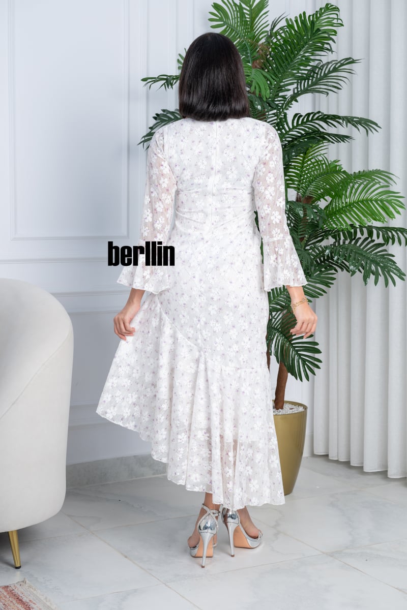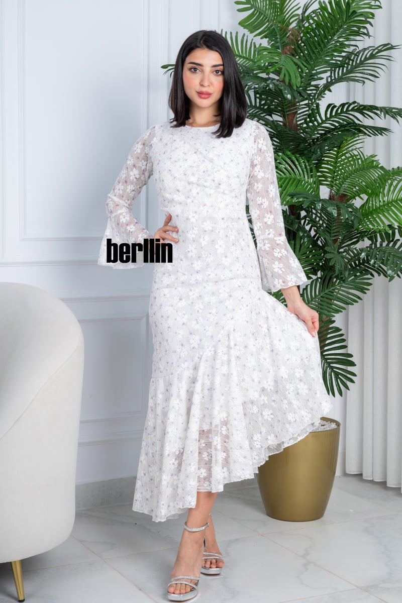 - الفستان يأتي بلون أبيض ناعم مزين بتطريزات زهرية صغيرة تضيف لمسة رومانسية ورقيقة.
