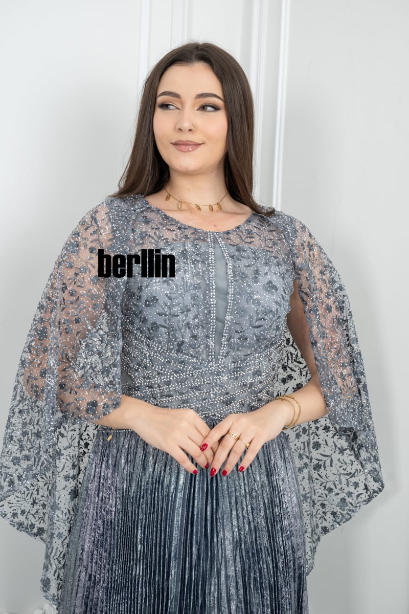 - أكمام من الدانتيل الفاخر مصممة على شكل كاب واسع، مما يضفي لمسة درامية راقية تناسب المناسبات الفخمة.
