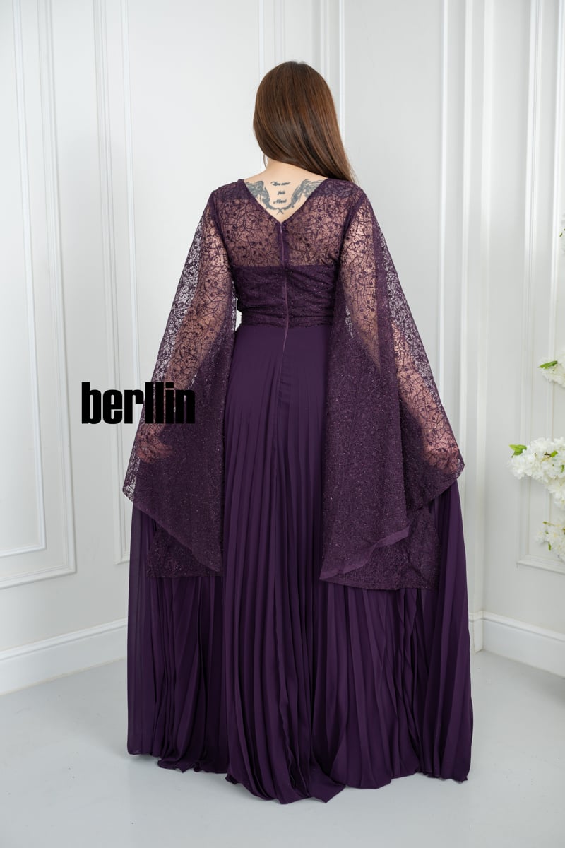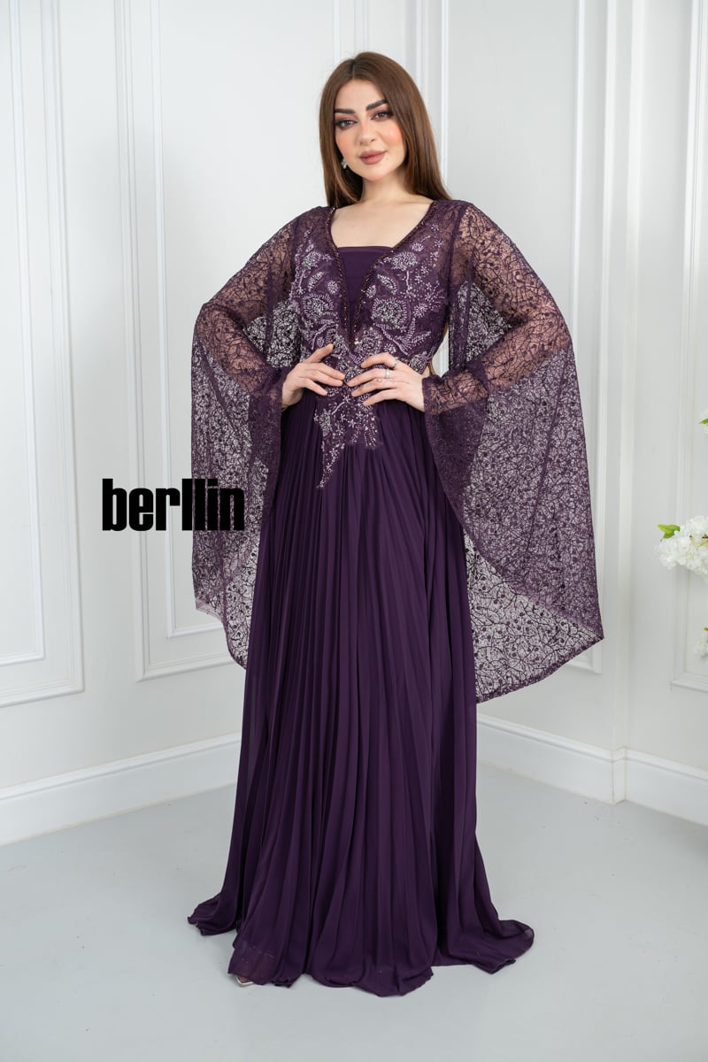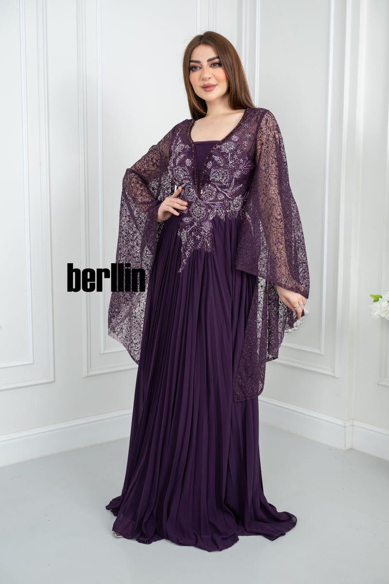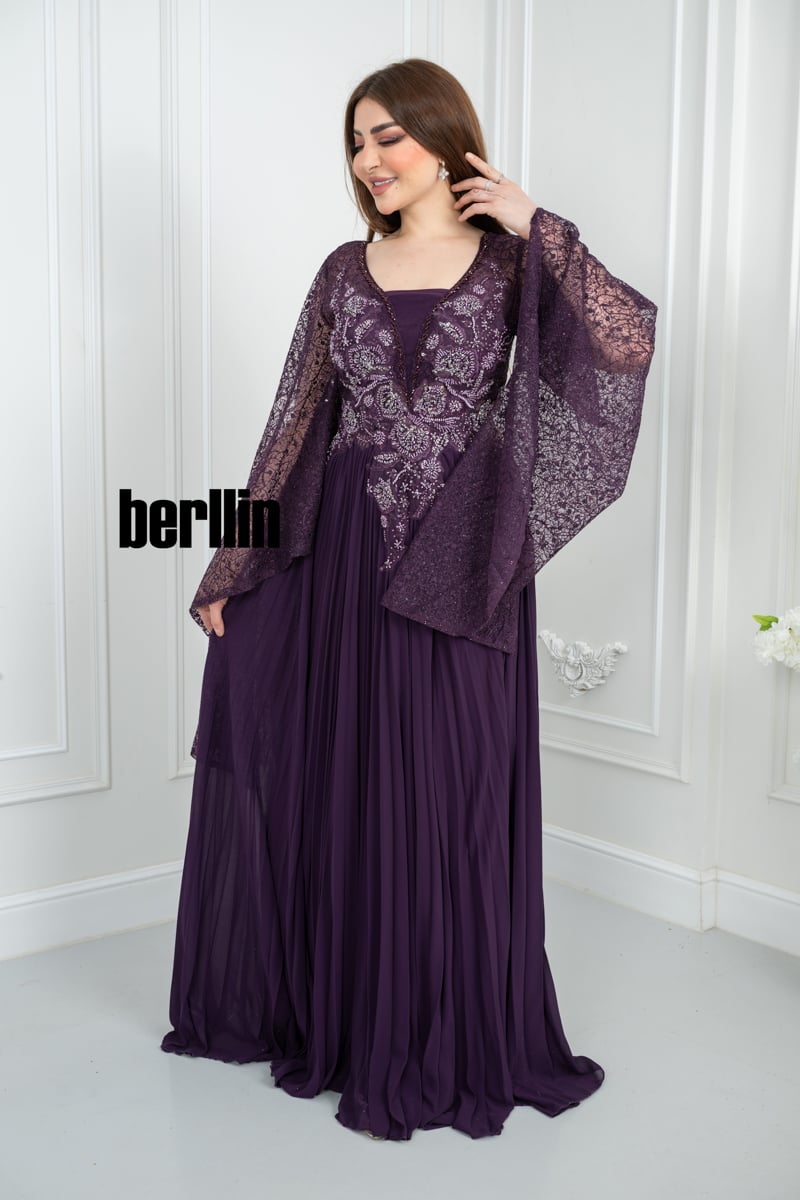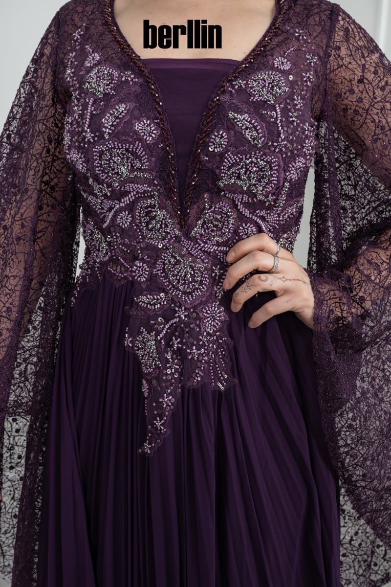 - الأكمام واسعة وطويلة من الدانتيل الراقي، تضيف لمسة أنثوية ناعمة وتتماشى مع التصميم الفاخر.