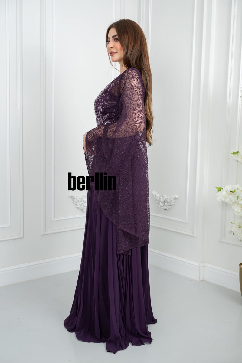 - الكاب مصنوع من الدانتيل الشفاف المطرز بنقوش متقنة تمتد بانسيابية من الأكتاف حتى أسفل الفستان، مما يمنحه طابعًا ملكيًا راقيًا.