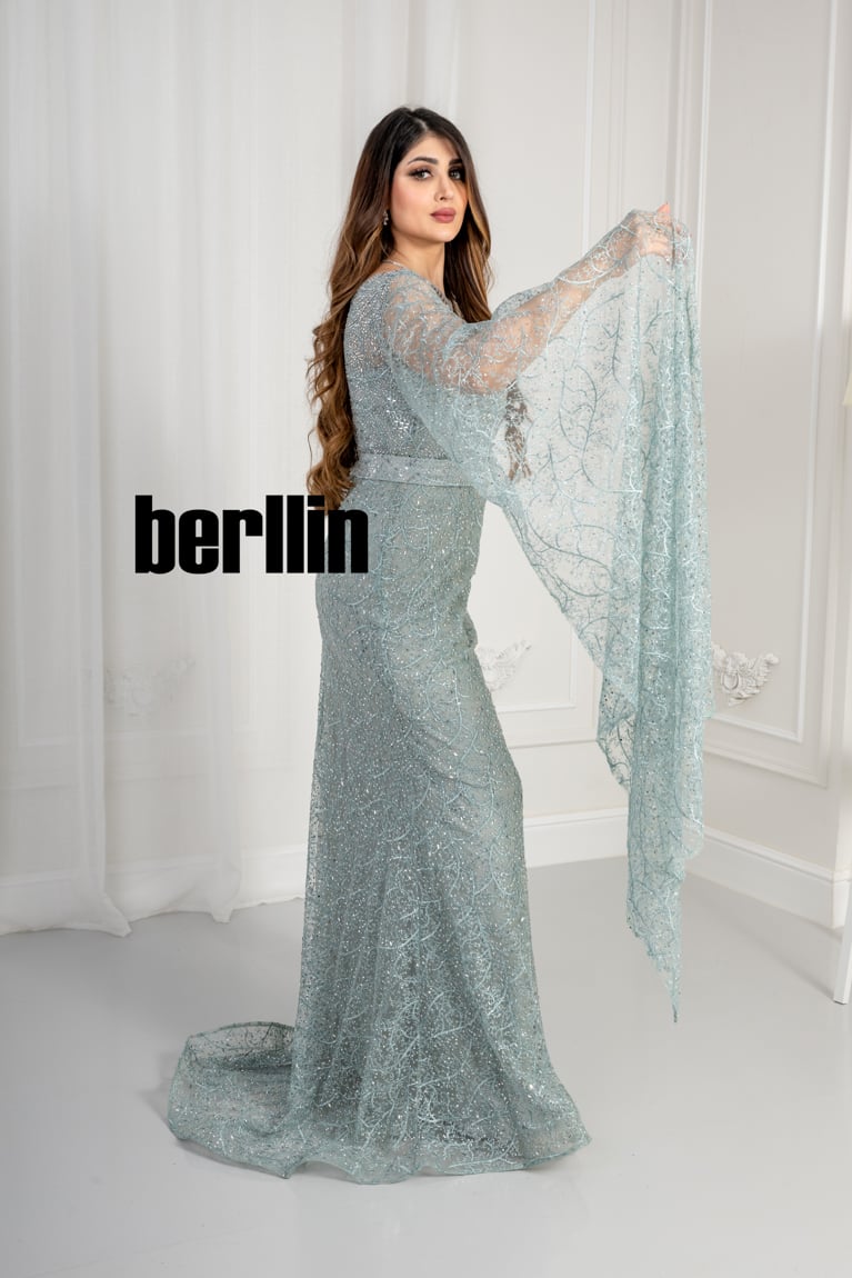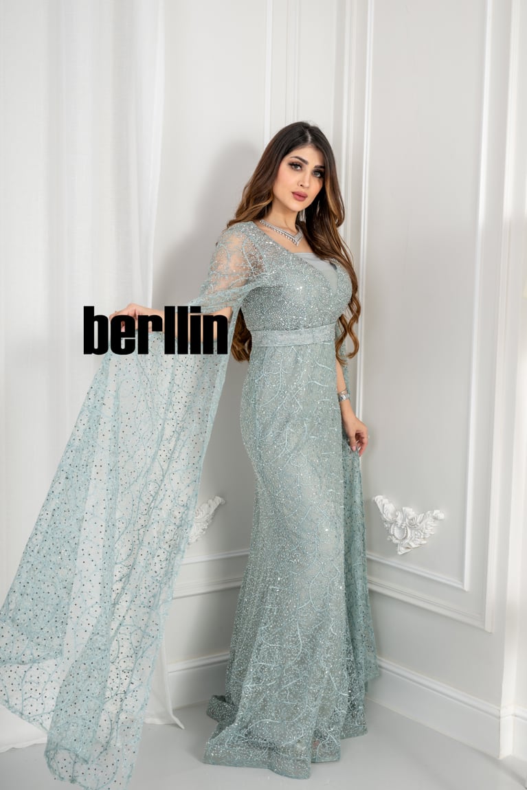 نوع التصميم: فستان سهرة مزين بالفصوص بأكمام كيب لون تيفاني فاتح