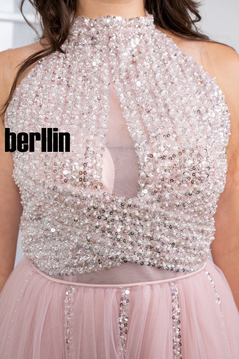 اخطفي الأنظار بإطلالة براقة مع فستان السهرة المذهل من برلين، فهو مصنوع من التول بأشرطة مطرزة بالخرز وتطريزات بالترتر اللامع تعكس الضوء مع كل خطوة. ويمكن تنسيقه مع إكسسوارات بسيطة وحذاء كلاسيك لتظهري روعة التفاصيل البراقة التي تزينه.