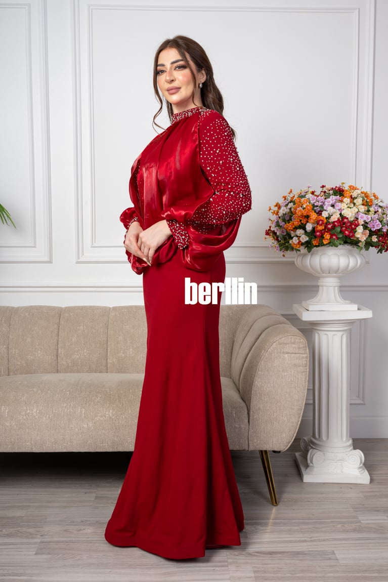اكتشفي فستان سهرة طويل مميز بالفصوص لون احمر رائع وقصة لف وبفتحة مميزة بالفصوص العصرية. مثالي لإطلالة أنيقة ومتوفر بجميع المقاسات.