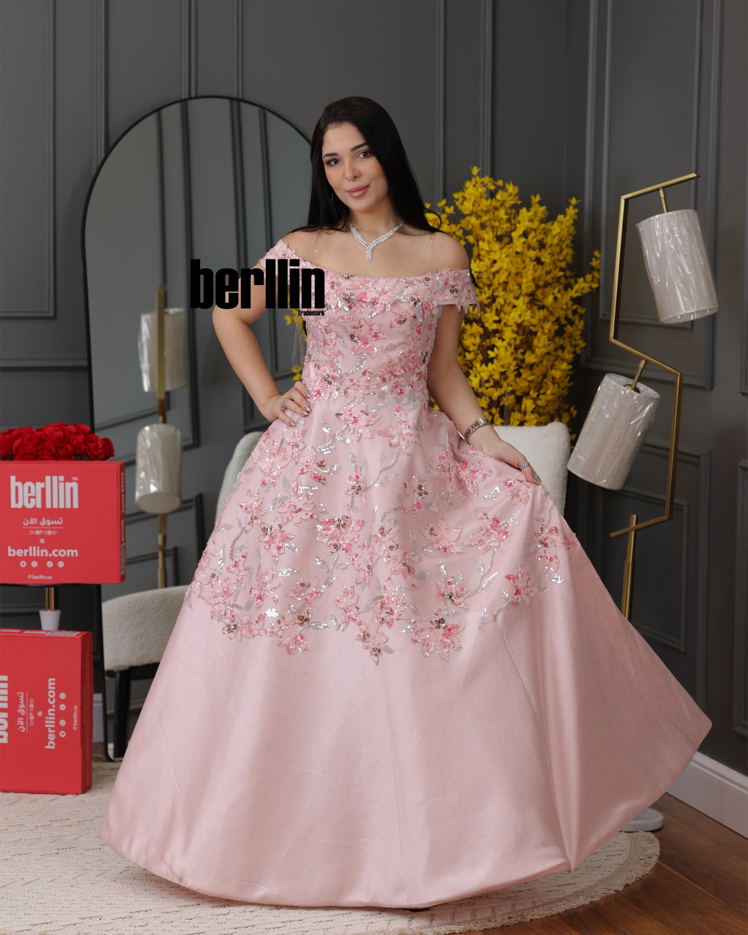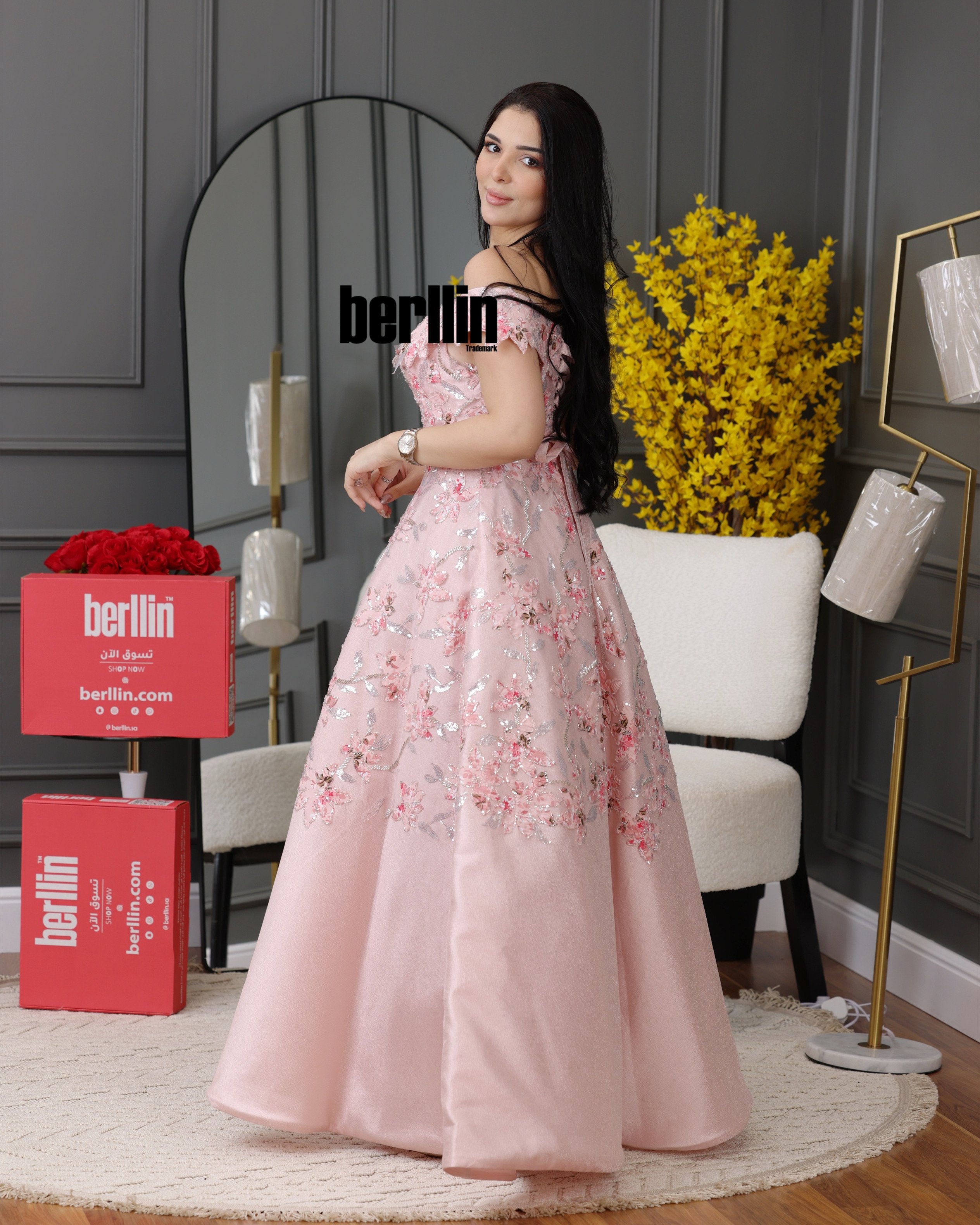 نوع التصميم: فستان سهرة وردي بأكتاف مكشوفة مزينة بورود مطرز