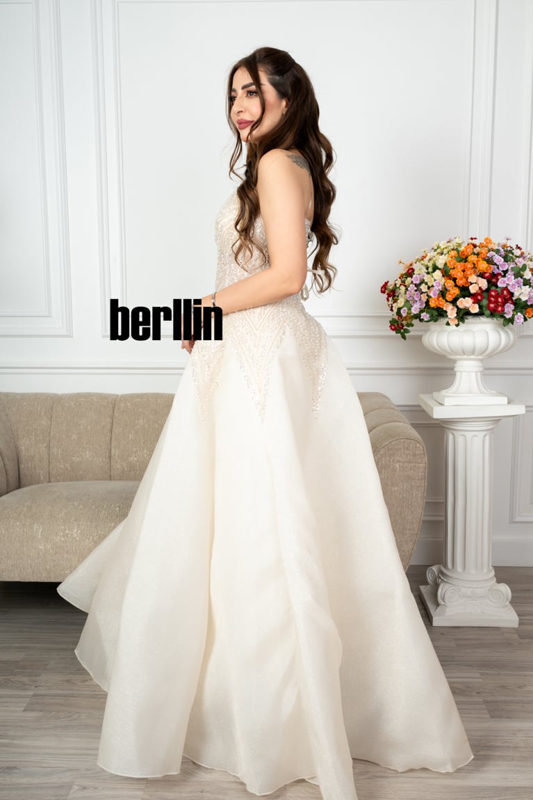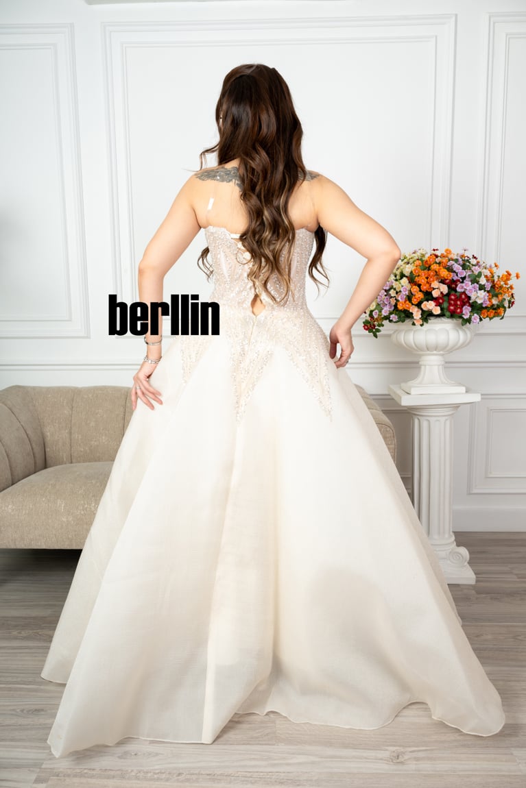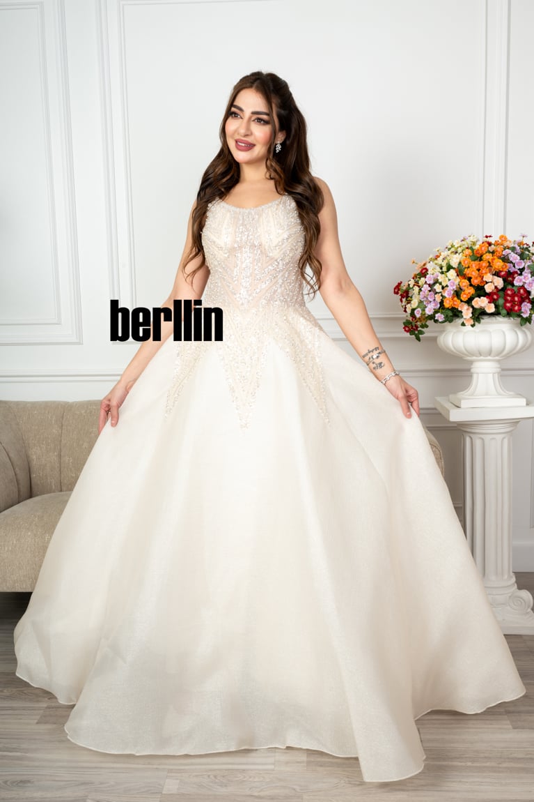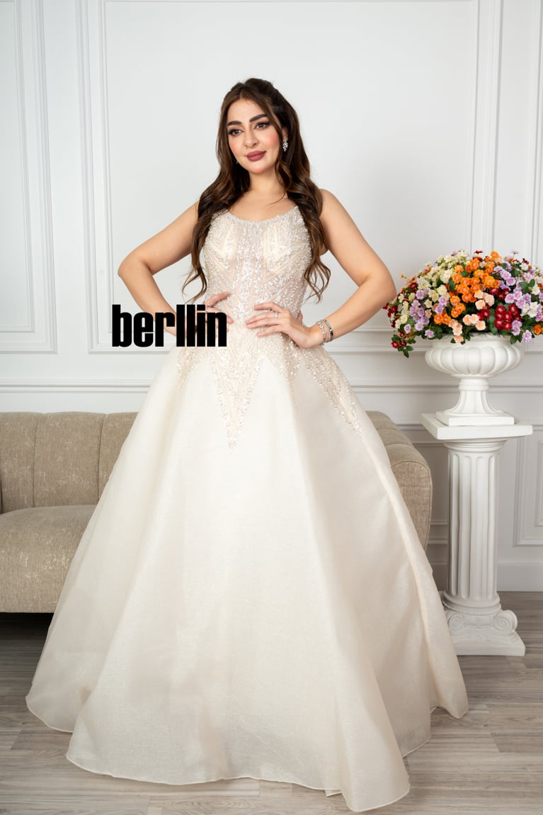 نوع التصميم: فستان سهرة طويل مطعم بفصوص الكريستال لون بيج