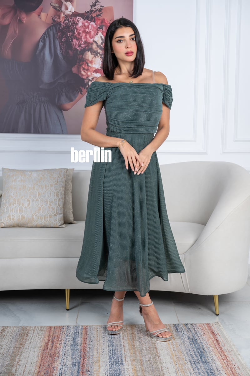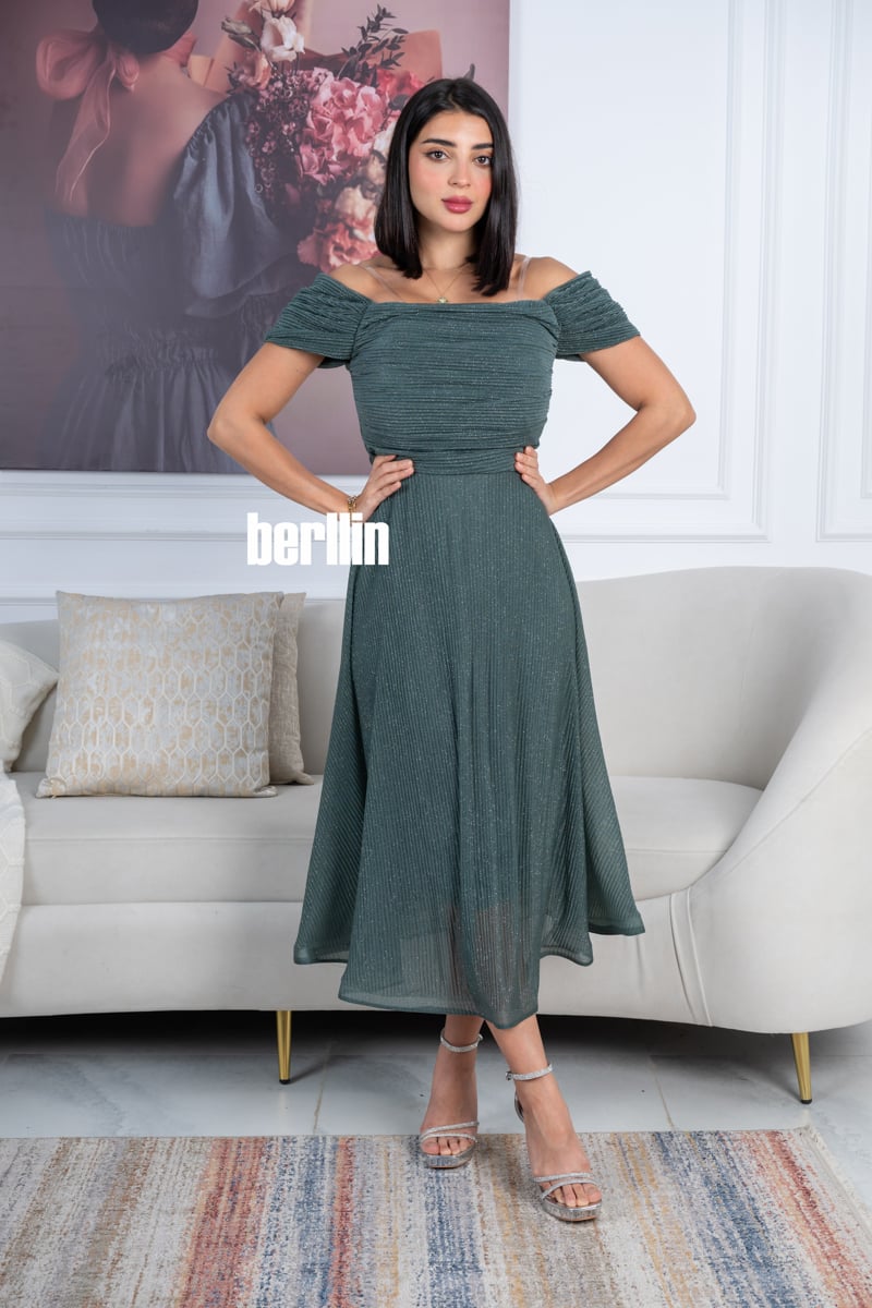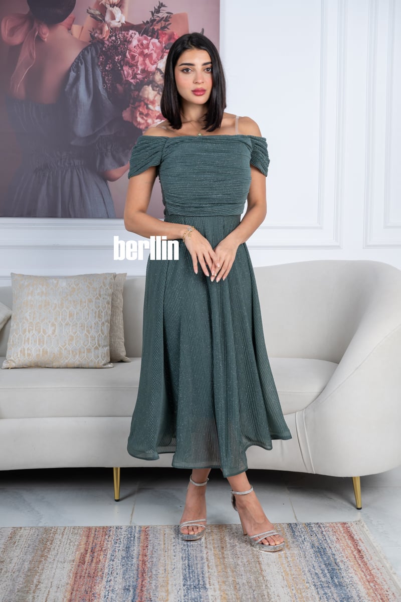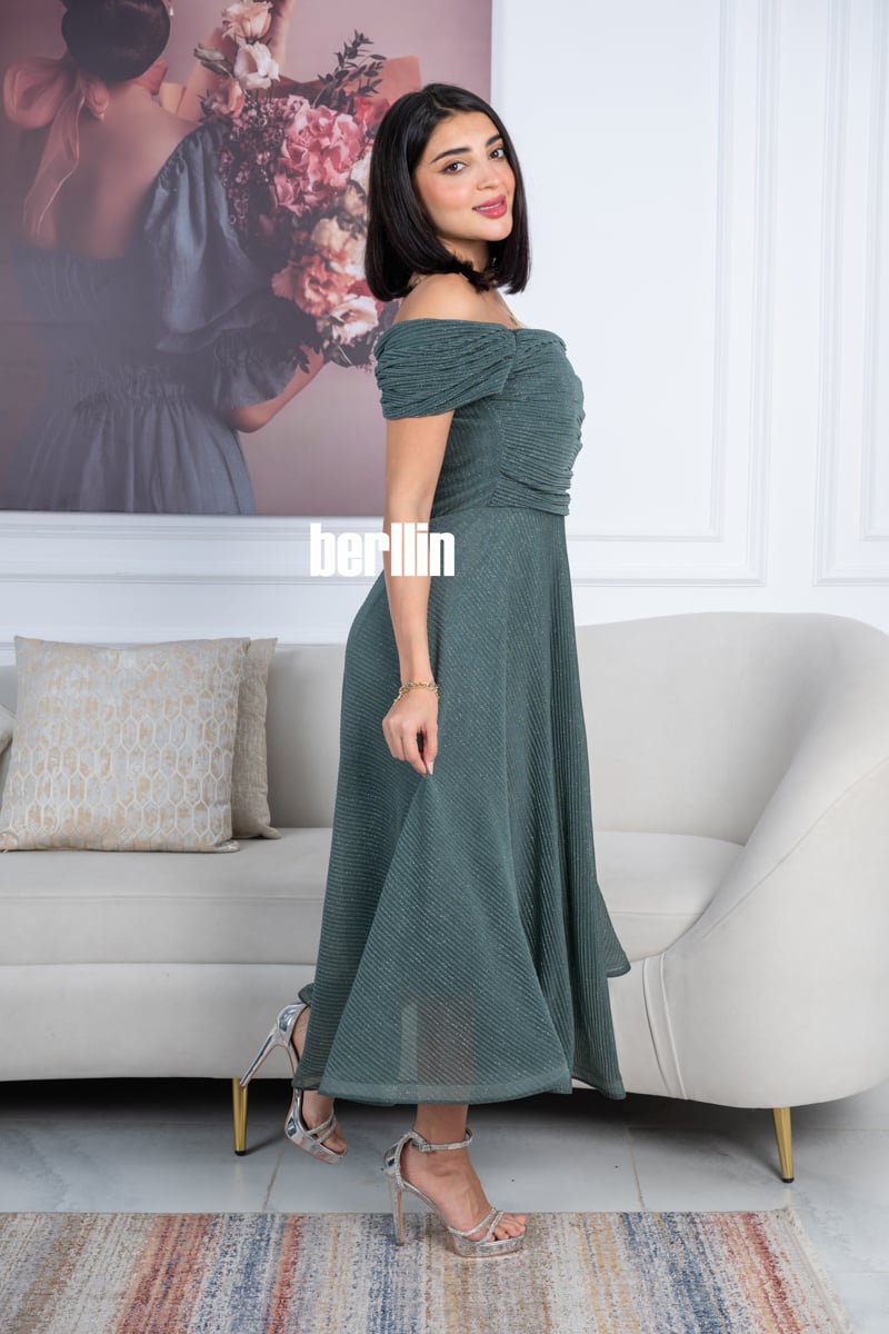 يتميز هذا الفستان بلونه الأخضر الداكن الراقي مع لمسات براقة تضيف لمعة ناعمة تناسب السهرات والمناسبات الخاصة.