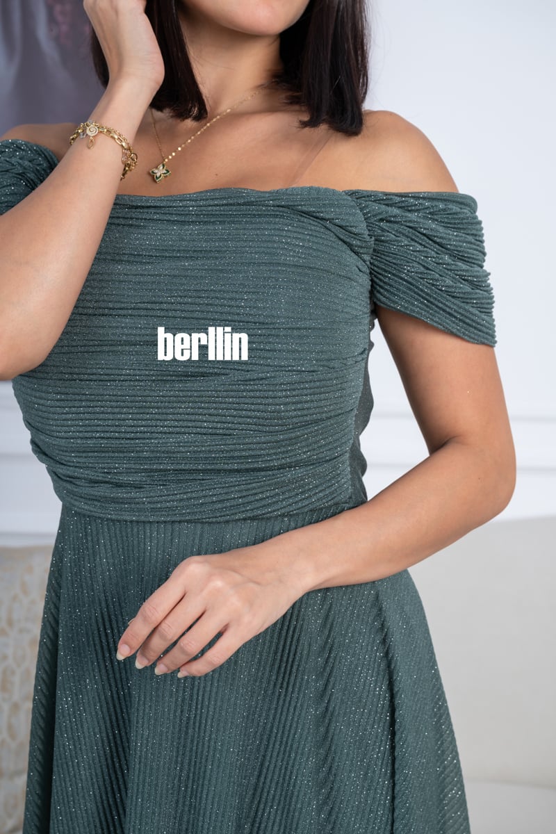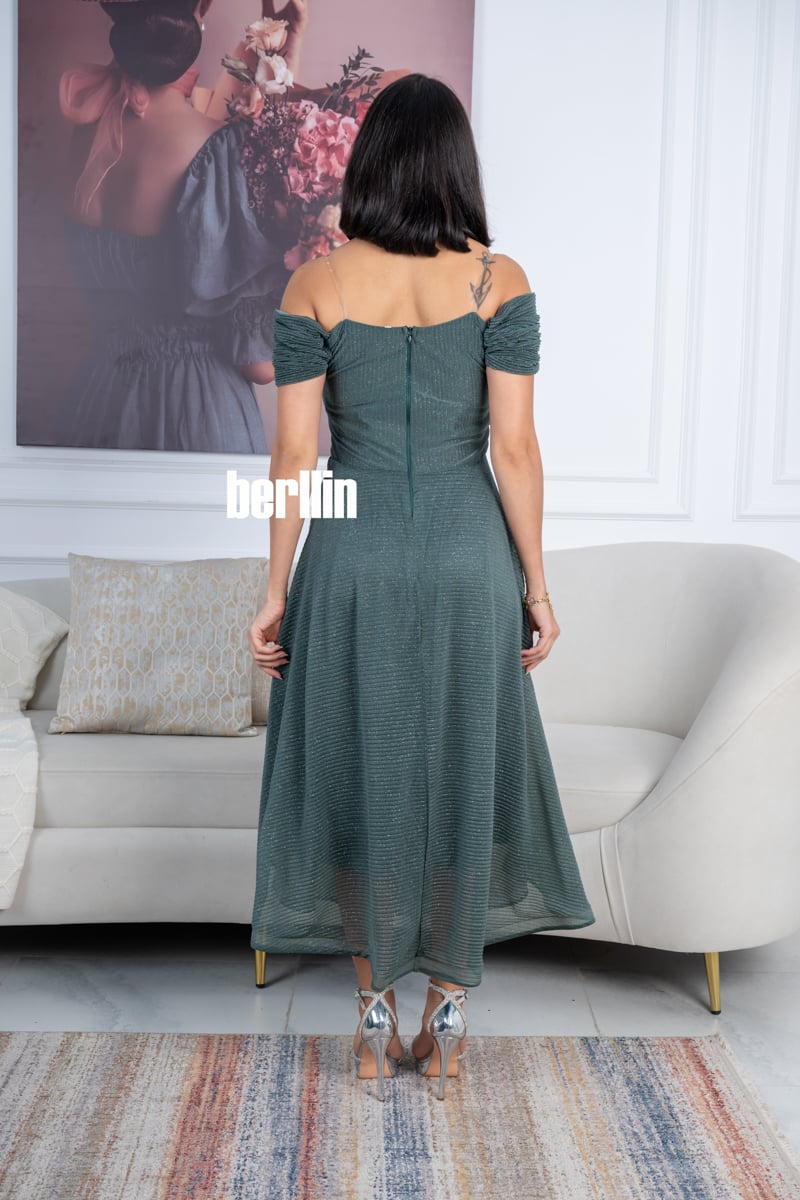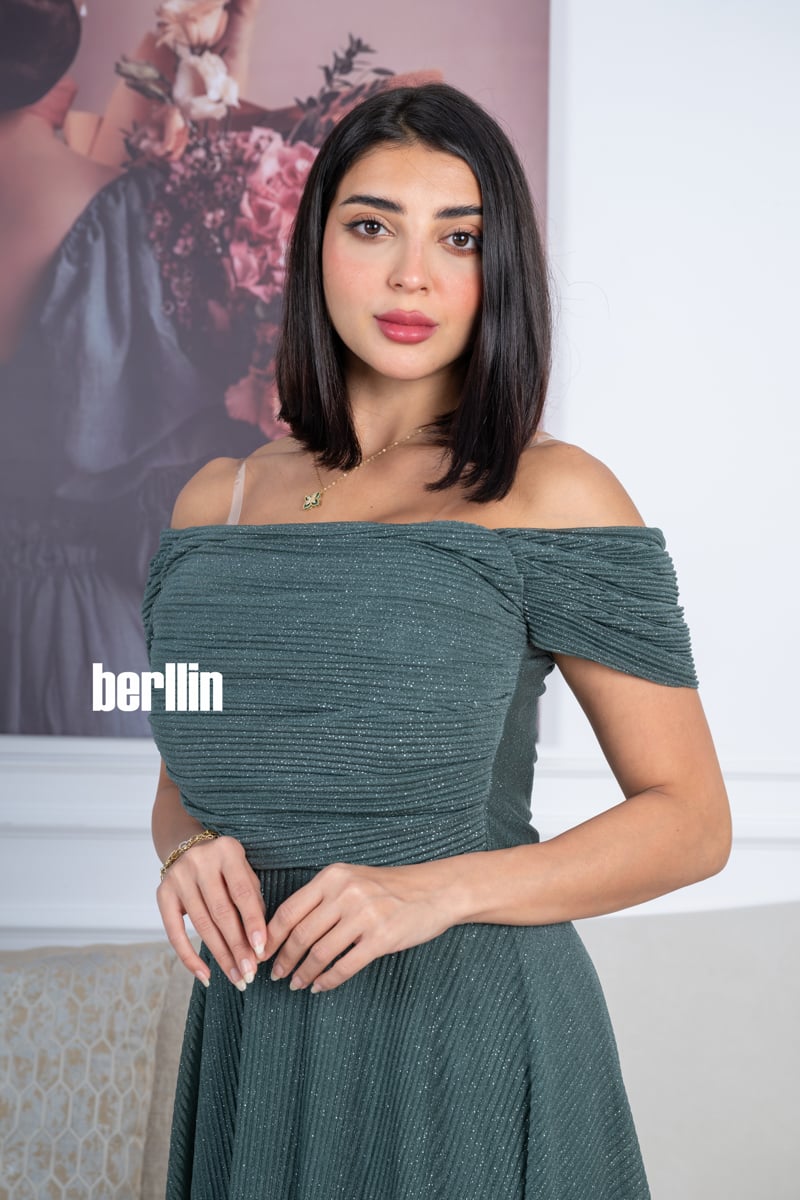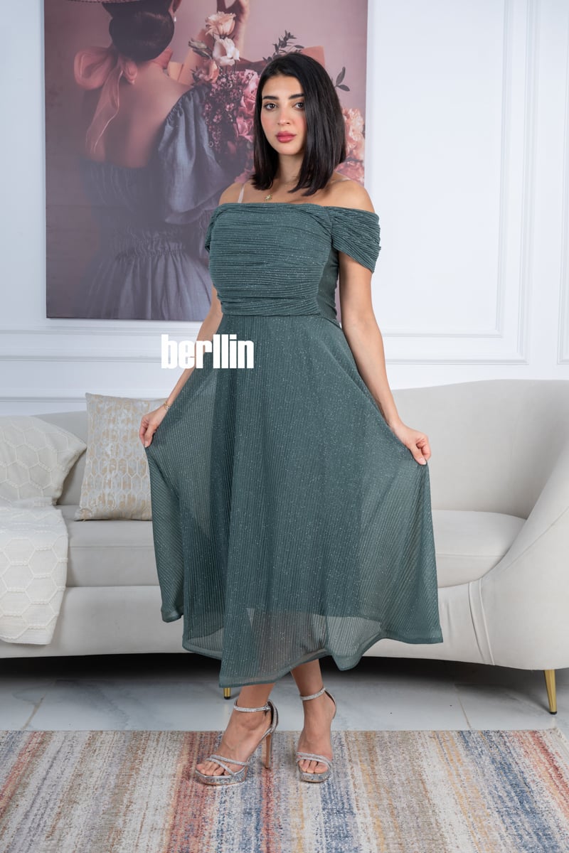 يتميز هذا الفستان بلونه الأخضر الداكن الراقي مع لمسات براقة تضيف لمعة ناعمة تناسب السهرات والمناسبات الخاصة.